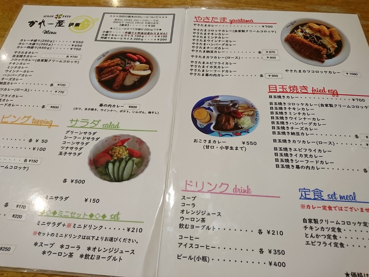 メニューには、いろんなのが載っているけど、要は、何をトッピングするか、たまごはやさたまか目玉焼きかによって、多彩に組み合わせられるってこと。やさたまイカ天カレーとか、やさたまシーフードカレーとか、なかなかレアな一品もあるから、いろいろ組み合わせるのが楽しいんだ。