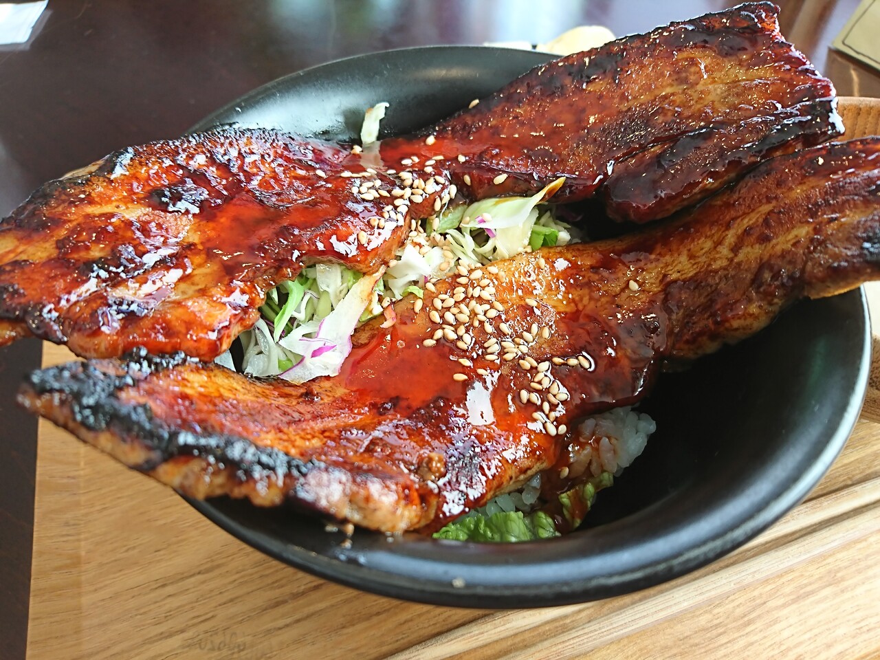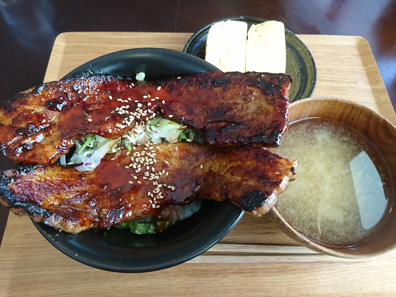 大きくて厚めの豚バラ肉に下味をつけて照り焼きにしたのが2枚、丼ご飯の上にでーんとのって登場したよ。