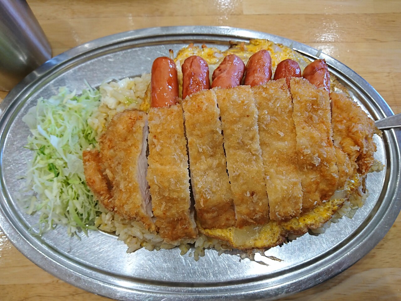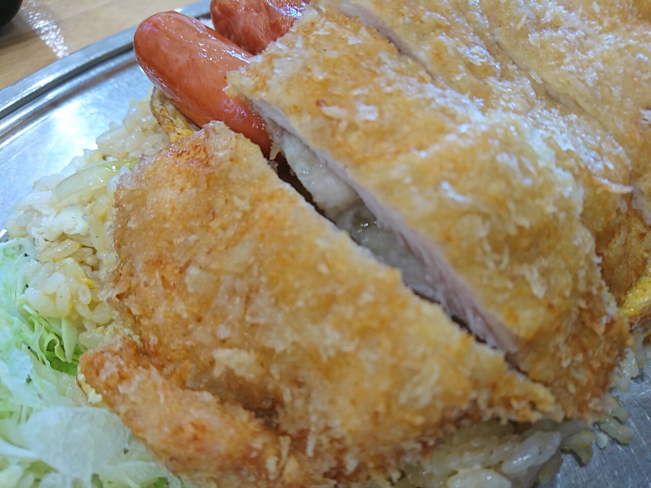 かくして登場したのがこちら。バターライスは、言ってみればチャーハンなんだけど、その味は唯一無二で『かれえていのバターライスの味』としか言いようのない味わい。それを覆い隠すように、野菜を入れた薄焼き玉子焼きをのせ、さらに、揚げたウインナを6本、大ぶりのチキンカツを1枚がのってくるという、珠玉の逸品だったんだ。