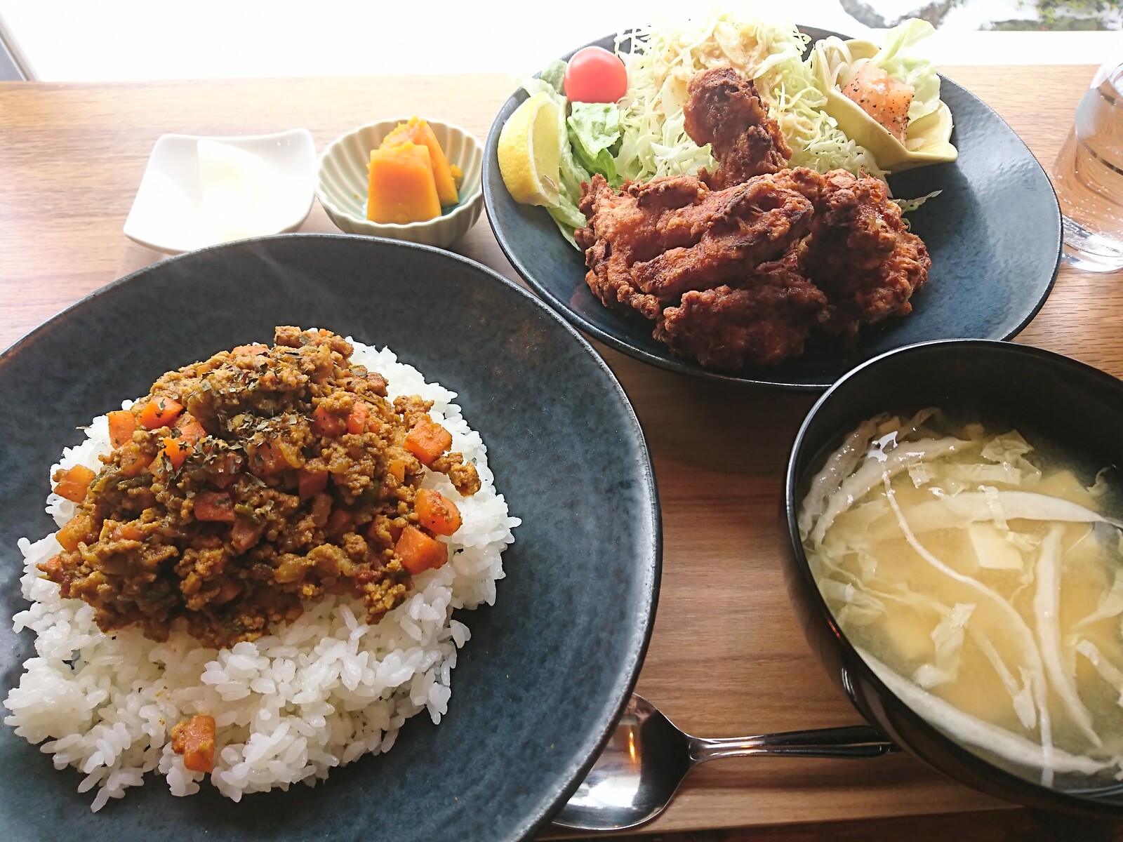 唐揚げもキーマカレーも美味しそう…😋