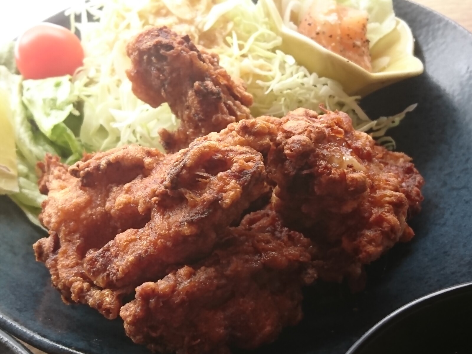 『鶏の唐揚げ』は、下味がよくしみていて、さっくり揚がっていて、大きなのが5個も入っていてと、味もボリュームも絶品の一品だったよ。小鉢に『鮭のマリネ』『カボチャの煮付け』付きと、箸休めもちゃんとあって、バランスよく考えられていたな。