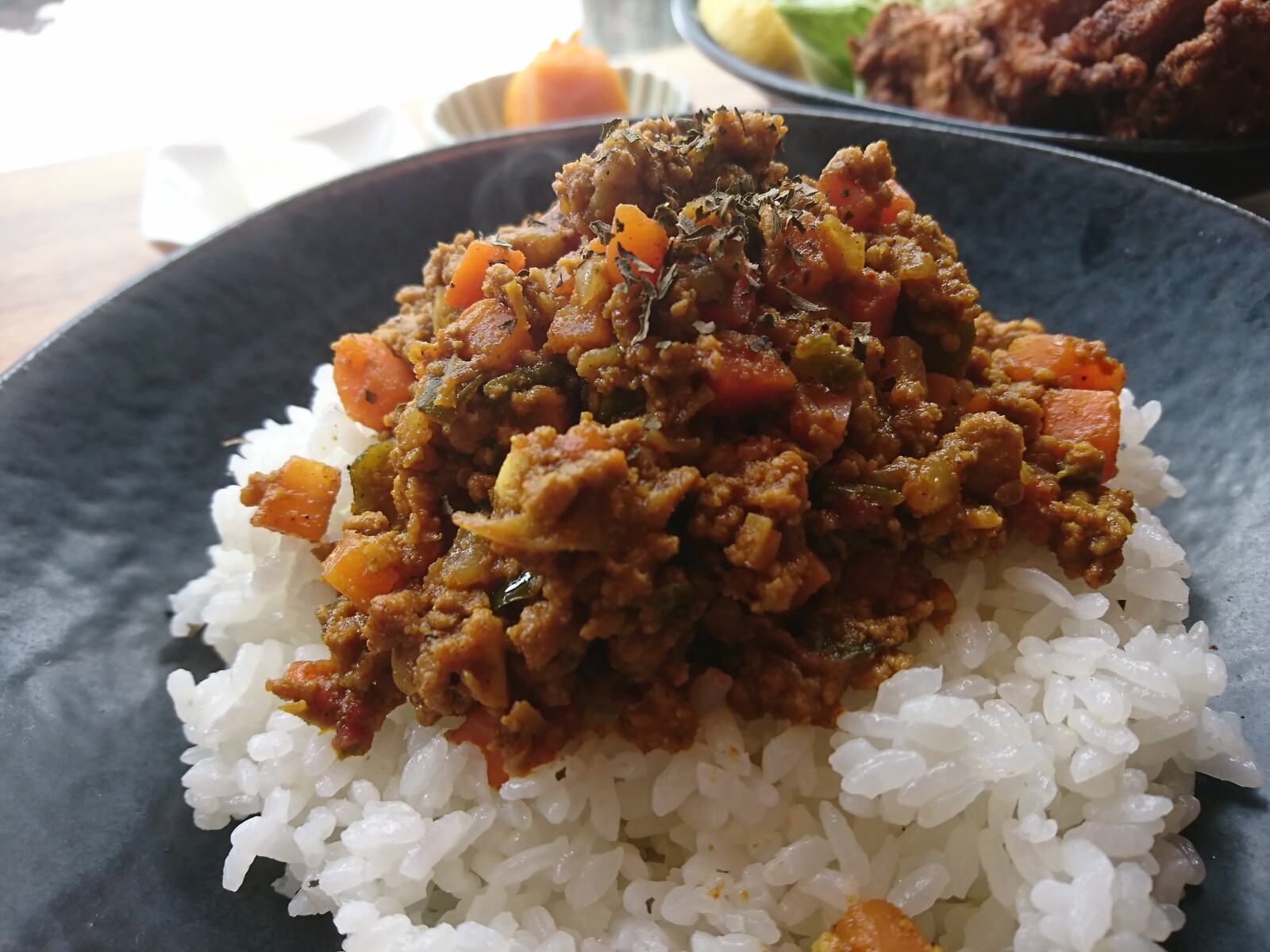 そしてこちらは『キーマカレー』。初めは、「キーマカレーに鶏の唐揚げ単品で注文できないか」って聞いてみたら、「+400円で、定食のご飯にキーマカレーをかけることができます」とのことだったので、そちらにさせてもらったよ。きっと、ボクと同じことを言う人が何人もいたに違いない。