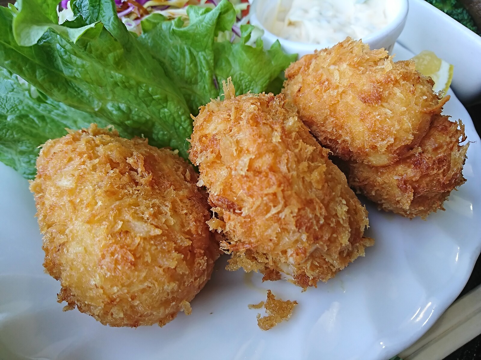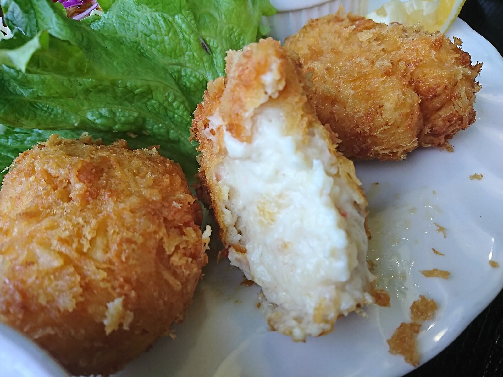 カニクリームコロッケは、大きなのが3個も載っていたよ。右のなんて、ちょっと形が面白くなっていて、いかにも手作りな感じが好感が持てるよね