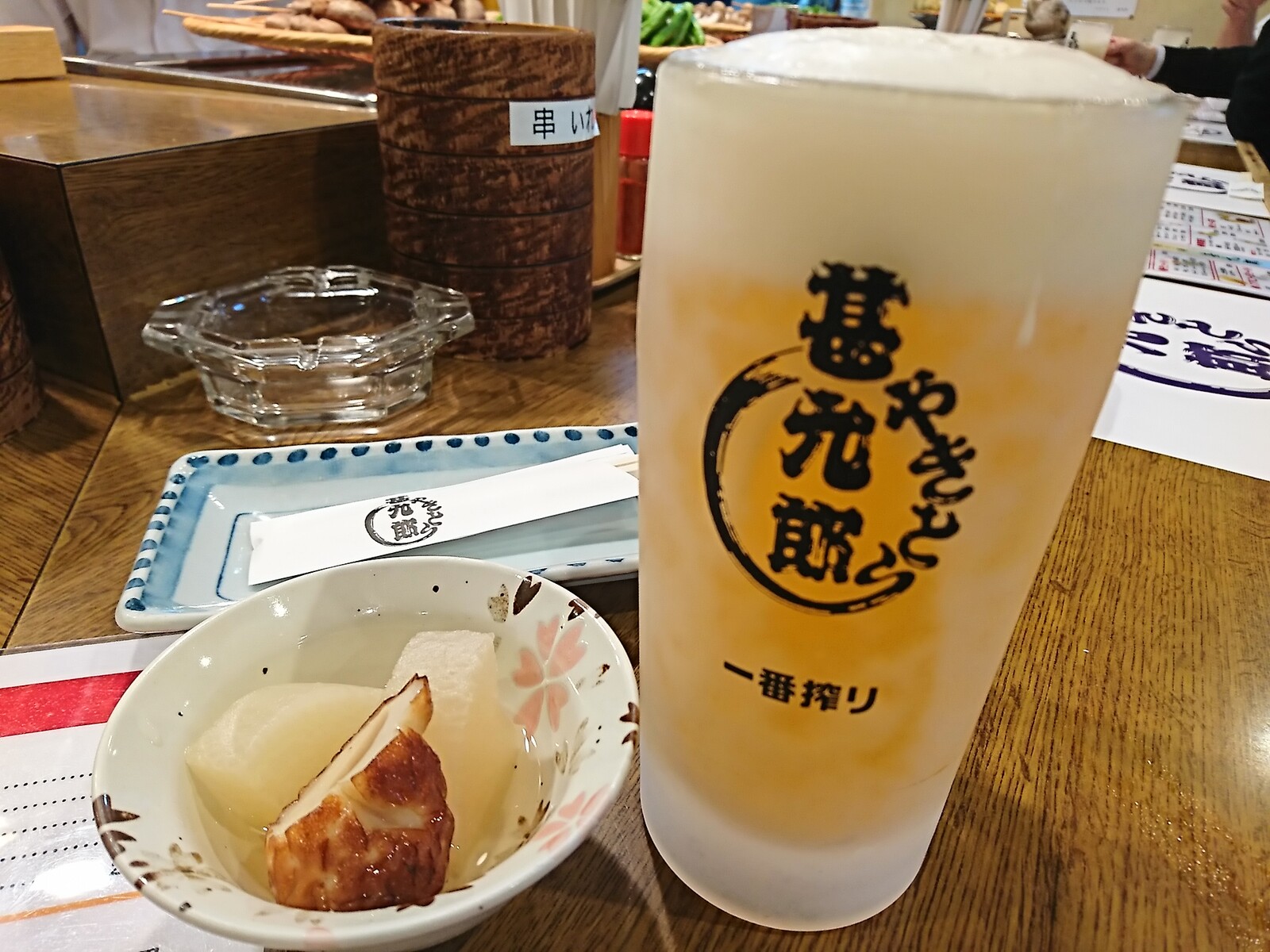 この日は、総曲輪にある老舗の焼き鳥屋さん「甚九郎」に寄り道してみたよ。このお店に早い時間に行くと、カンカンに凍らせたジョッキにビールを入れてくれるんだ。かくして登場したのがこちら。じゃりじゃりした氷が浮いている、冷え冷えの生ビールをいただくのだ。