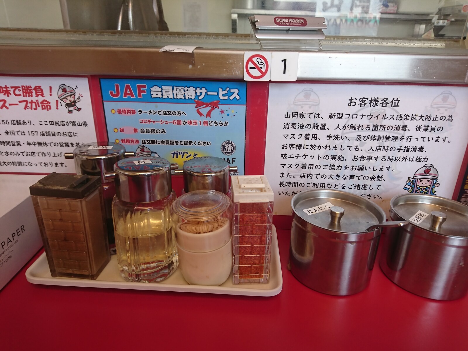 この日は、国道8号線の田尻交差点付近にあるラーメン店「山岡家富山田尻店」に、寄り道してみたよ。けっこうな数のコアなファンがいるとうわさされる、全国チェーンなこのお店。特にトラックドライバーにファンが多くて、行く先々の「山岡家」に行くんだ、などという話も聞いたことがあるよ。
