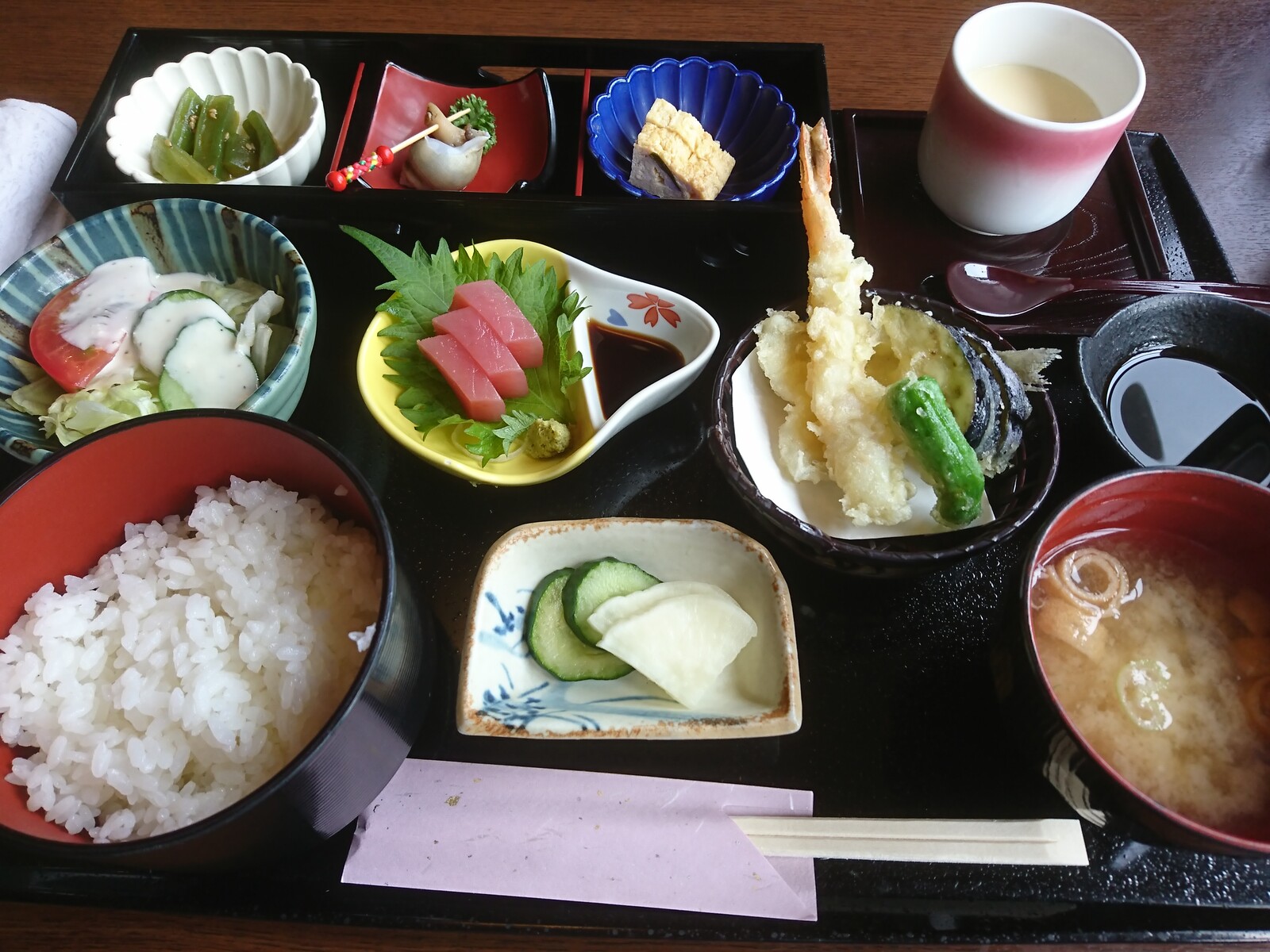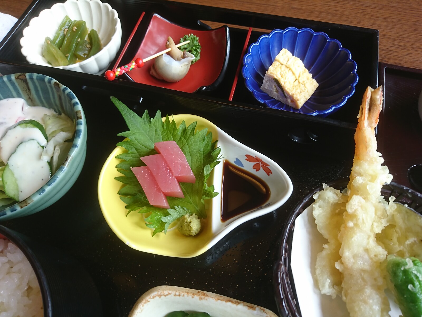 かじきマグロ=さすの造りとえびやきすなんかの天ぷらをメインにした、とても盛りだくさんの御膳だったよ。だし巻き玉子、ばい貝の煮付けと、おそらく茎わかめの入った小鉢3皿も、しっかりおかずになるんだよね。