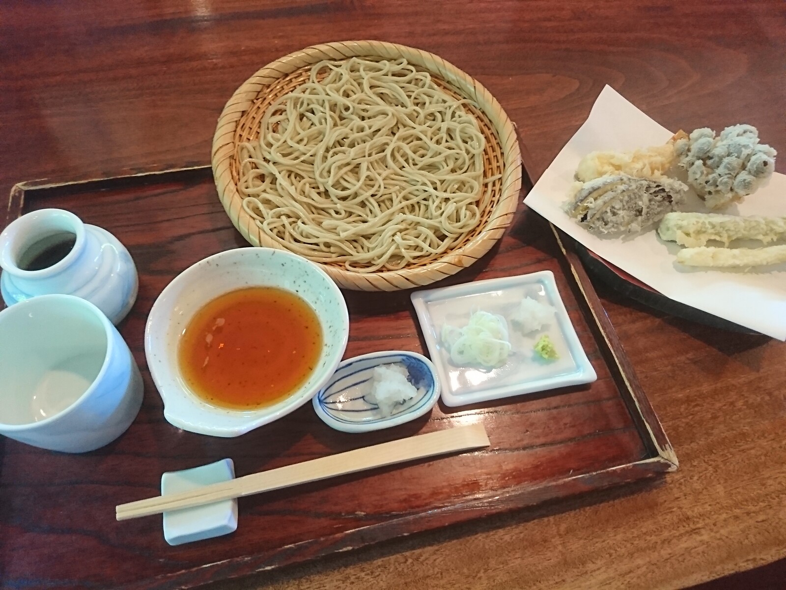 この日の注文は「ざるそば」と「天ぷら盛り合わせ(小)」。登場したのがこちらだよ。