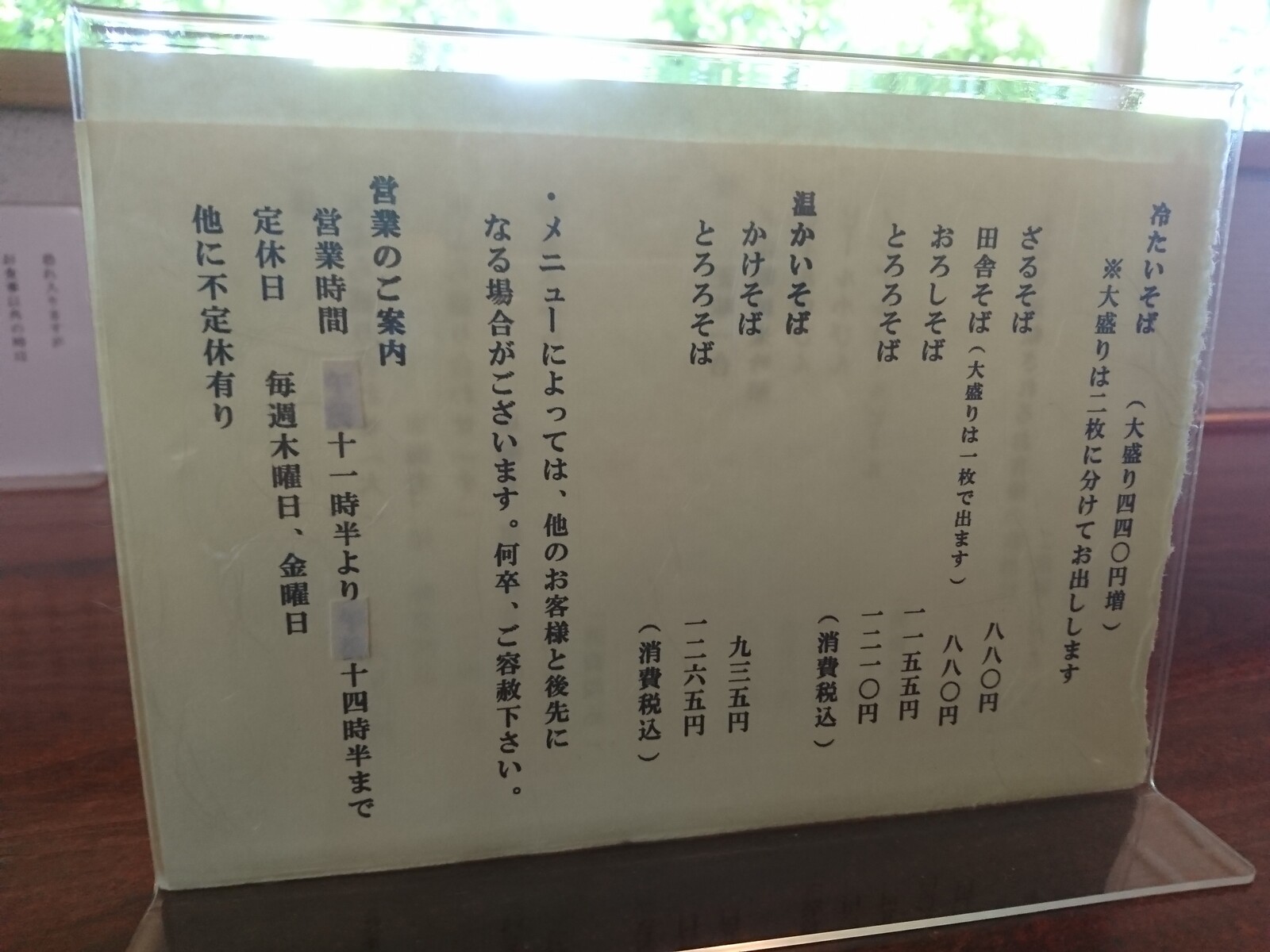 メニューはこんな感じ。具をのせたそばは、おろしかとろろしかないという潔さ。そばそのものを味わってほしいというご店主の願いが伝わってくるよね。