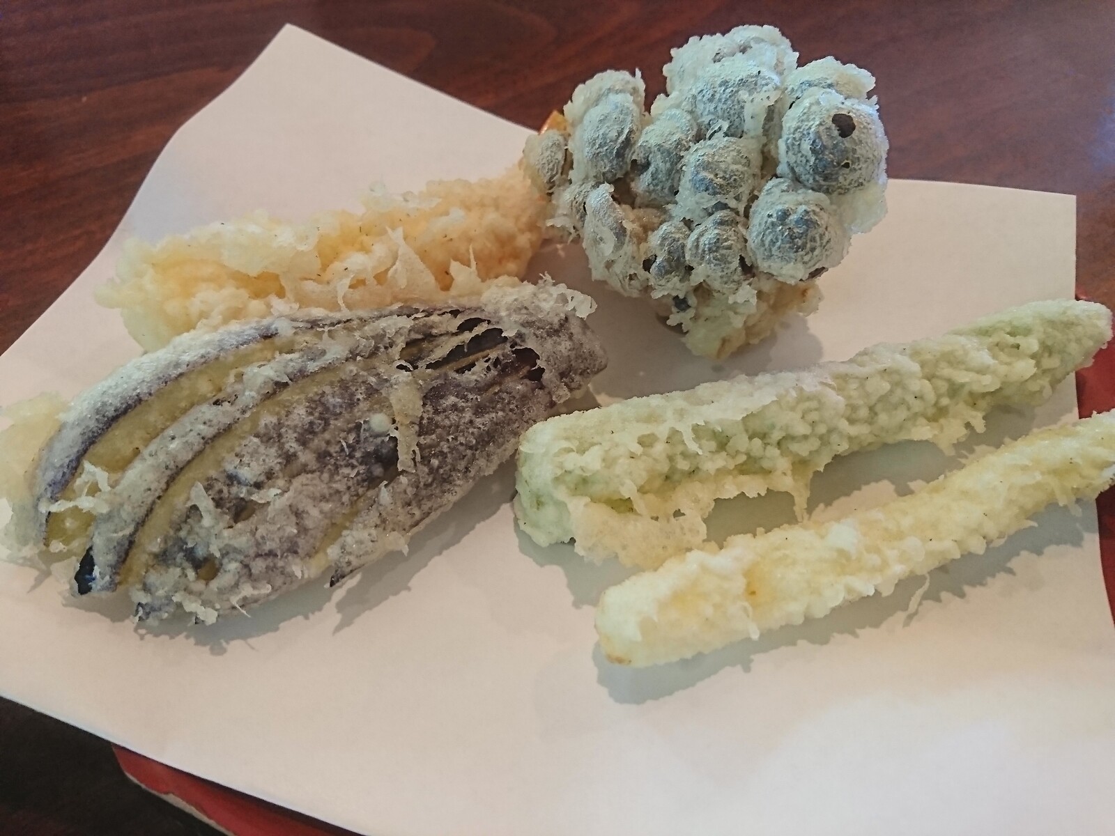 天ぷらには、海老が1尾と野菜が4品揚げられていたよ。さっくりした衣につつまれた海老は、ちょっとざらっとした舌触りがさすがの車海老だと思ったな。野菜の揚げ加減も、一番おいしいところで油から取り出した感が、これまた見事だったよ。