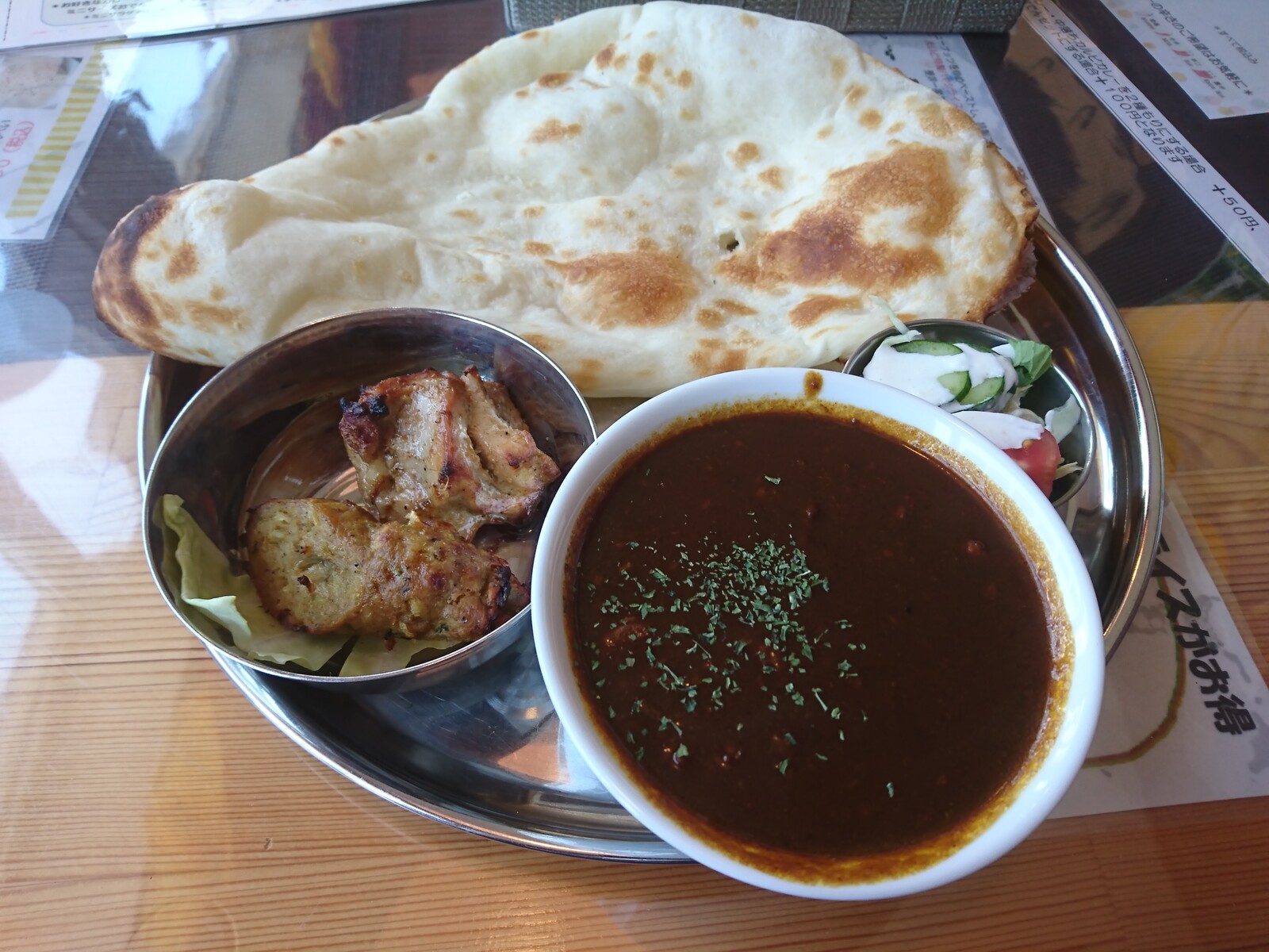 この日の注文は、チキンティッカとシークカバブのついた『まいどランチ』。カレーは、+100円して『ブラックキーマカレー』にしてみたよ。