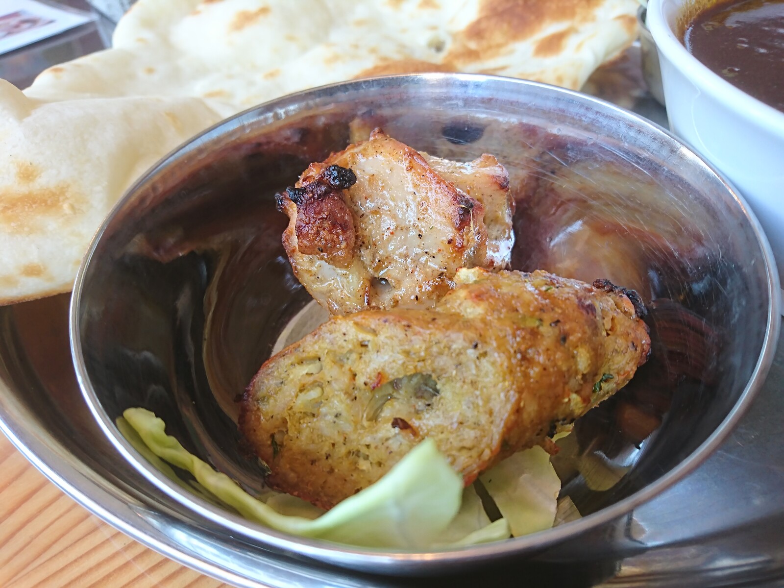 シークカバブは、ひき肉を串に巻き付けて焼いたスパイシーな料理。チキンティッカともども、タンドールで焼かれて、ちょっとカリッとしてて香ばしいところが、何ともたまらないよね。