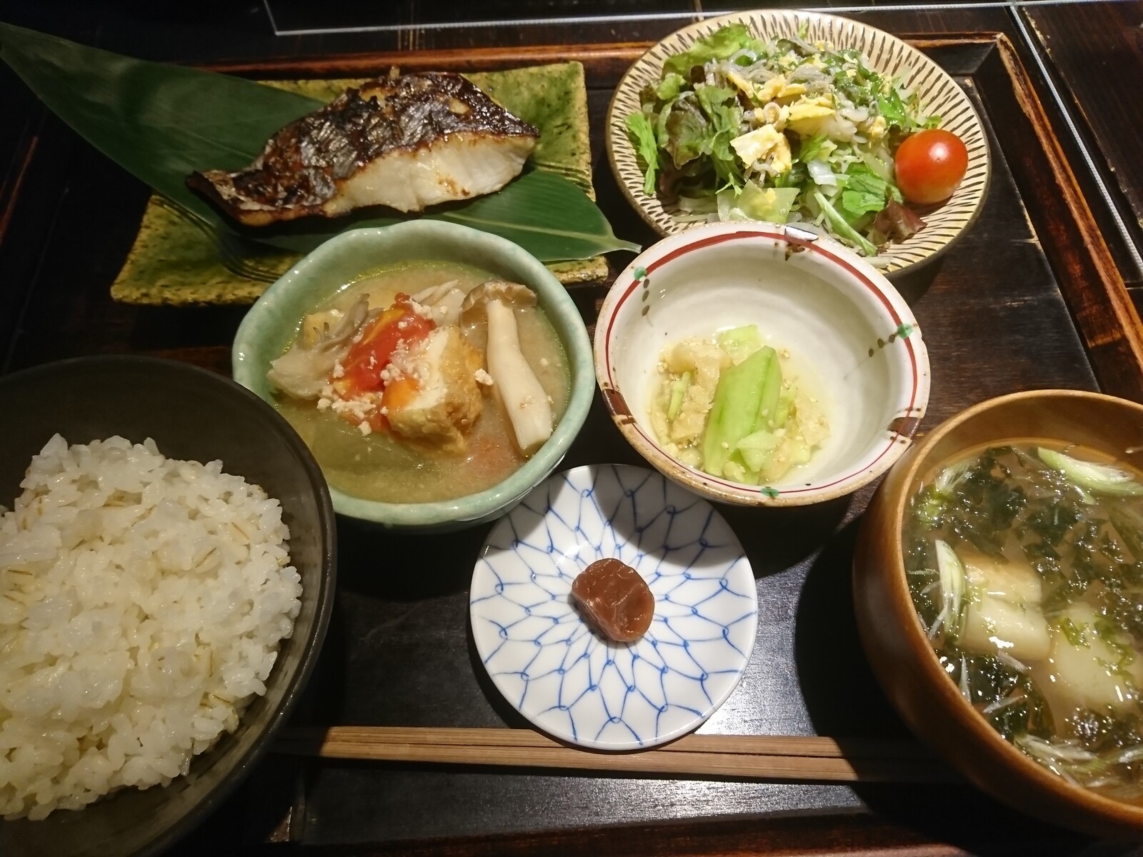 注文したのは『銀さわらの塩麴定食』。登場したのがこちらだよ。メインの銀さわらの他、小鉢が2皿とサラダ、みそ汁付き。今が旬の茄子のほか、みょうがやあおさも入った季節感たっぷりの味噌汁に、この店の本気度が伝わるというものだ。