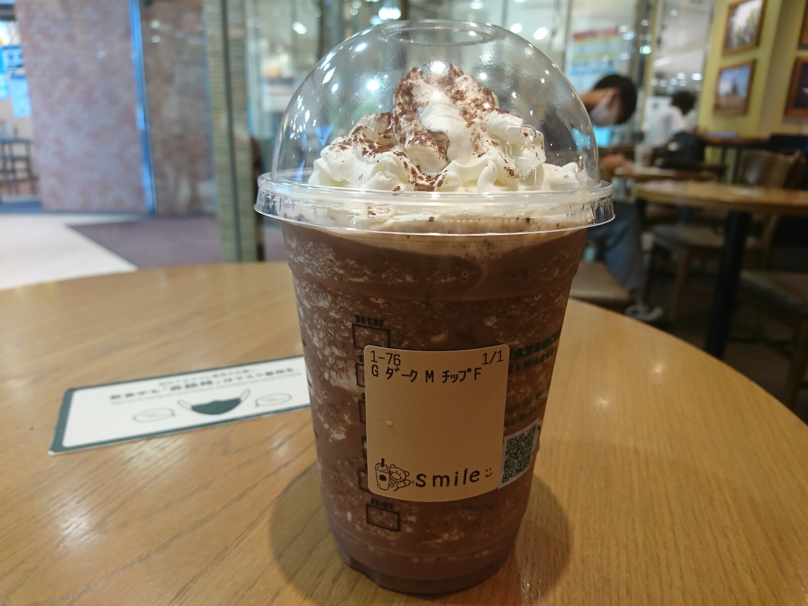 この日は、『ダークモカフラペチーノ』。たっぷり歩いて、冷たいものが欲しくなったんだ。ずるずるすすって一休みしたよ。