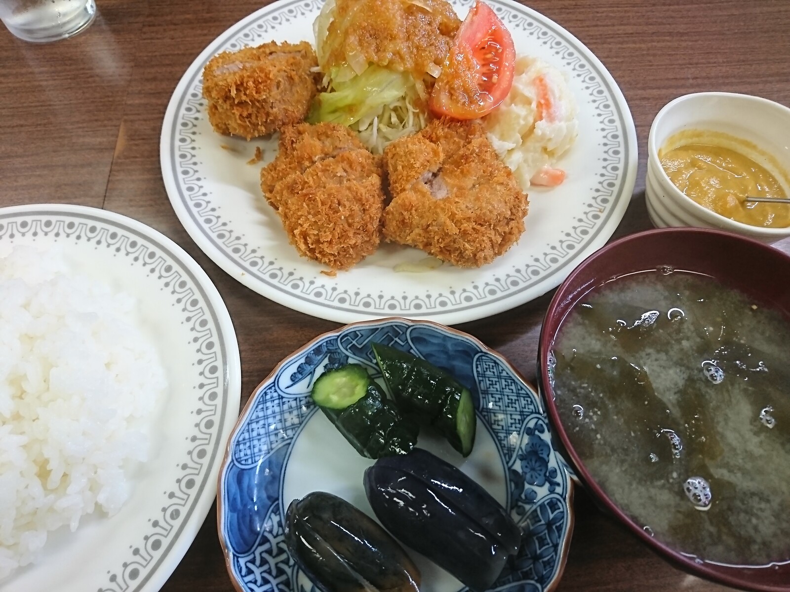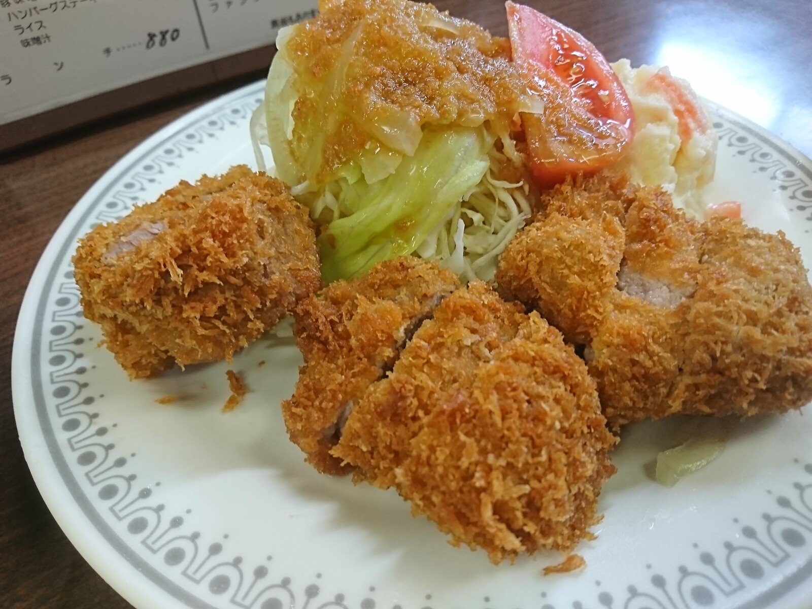 そして何といっても、このヒレカツが、さっくりと歯でかみ切れていく、見事な柔らかさの絶品。これが3個も入って、さらにうれしくなったよ。からしを付けて、ソースをたっぷりかけていただいたんだ。皿にのってるポテトサラダも、何気に絶品なのだった。