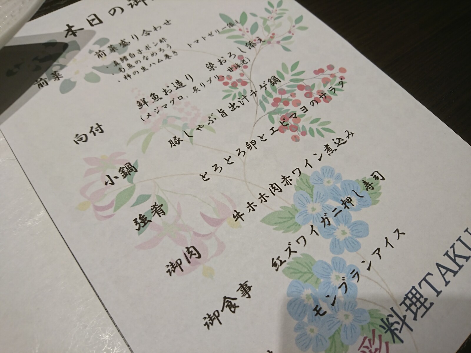 この店では、その日のコースをこうして教えてくれるんだね。『紅ズワイガニ押し寿司』もなかなかの逸品。なにしろ、けっこうお腹がいっぱいだったのに、食べてしまったくらいだからね。