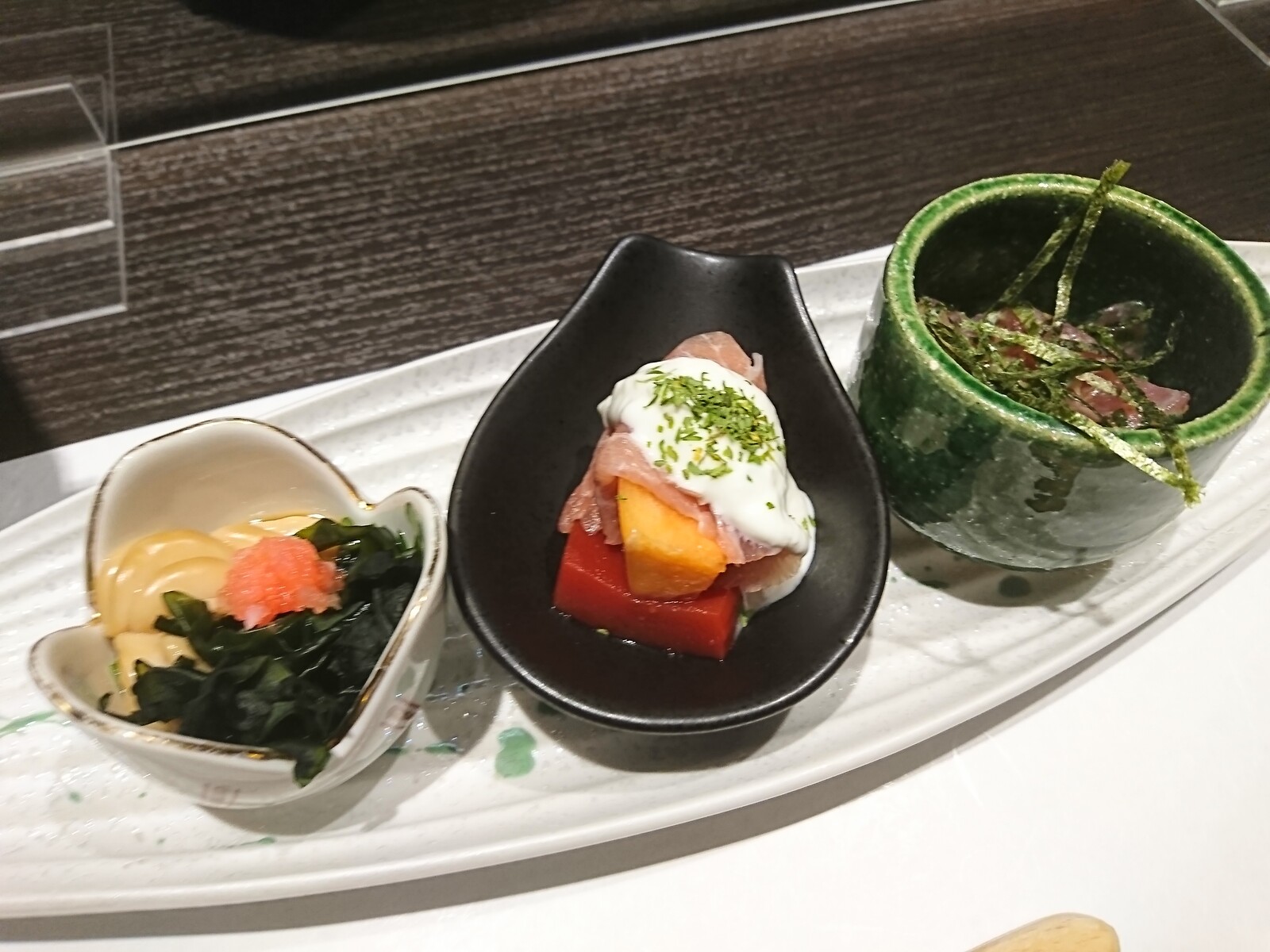 お通しには、『真鱈白子ポン酢』『旬の魚のなめろう』『柿の生ハム巻き』の3品。季節を彩る素晴らしき3品だったよ。