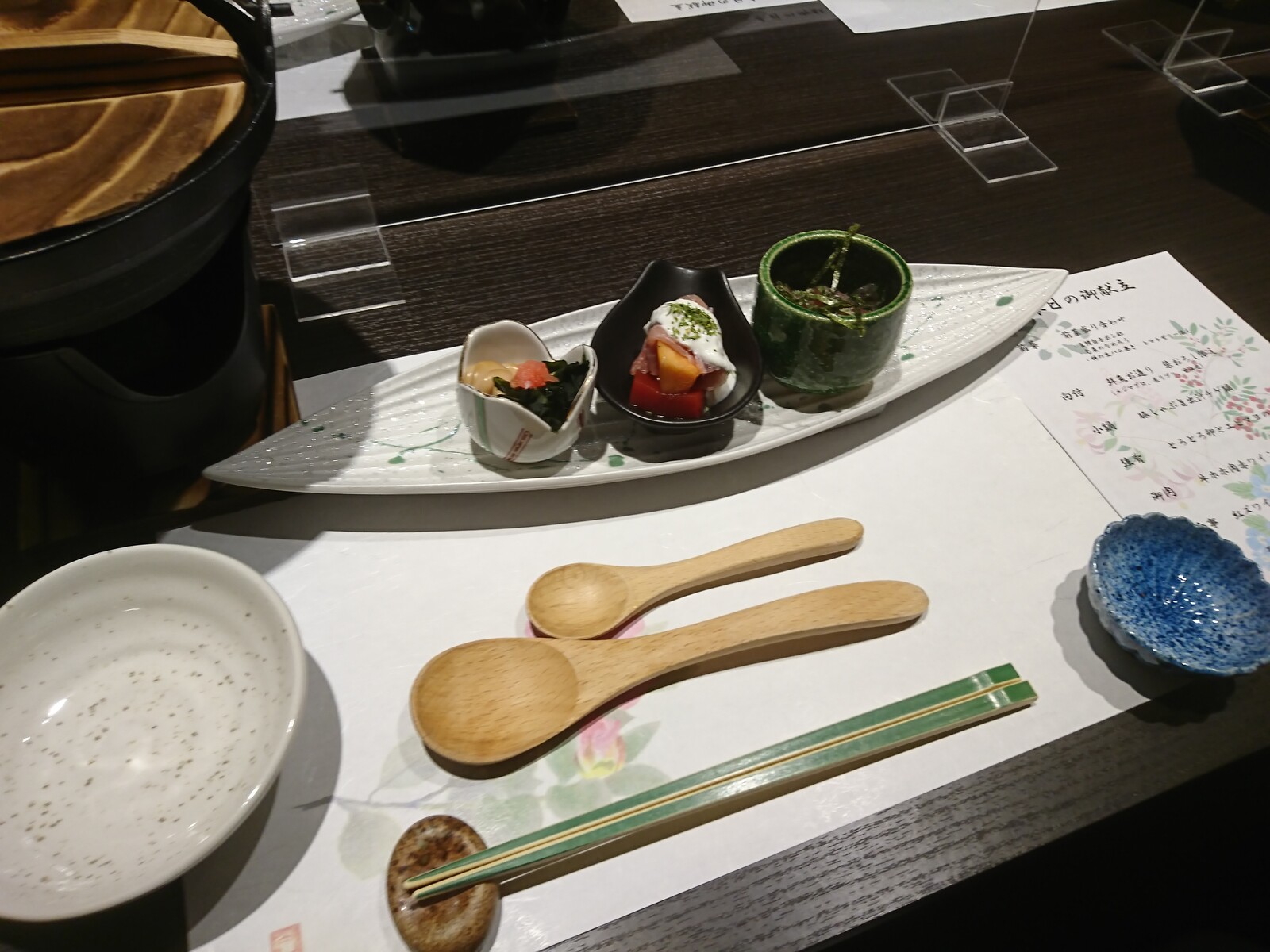 お通しとともに並んだ小皿やスプーンや箸。こんなコース料理らしい風景を見るのも、実に久しぶり。