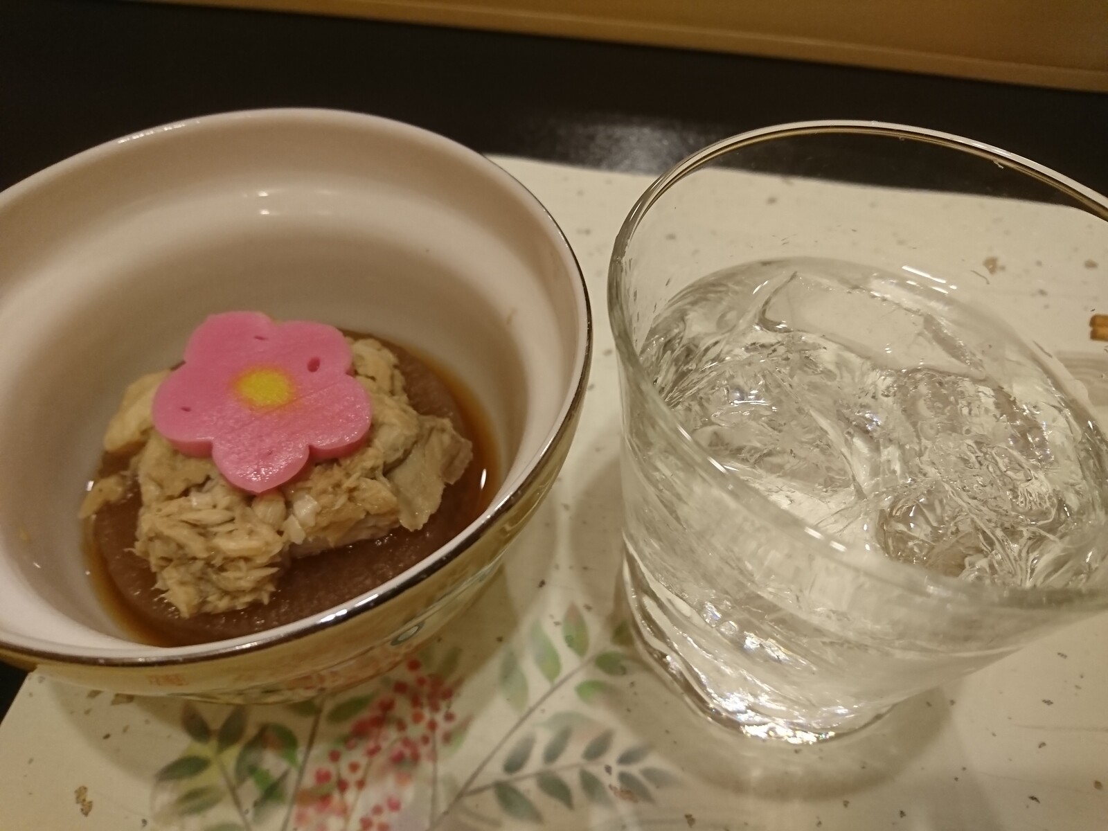 かくして、芋焼酎『元祖やきいも』をロックでいただくことにしたよ。焼き芋で仕込んだ芋焼酎は、甘い香りがやさしい、珠玉の逸品だったよ。横に添えられてるのは、『ぶり大根』なんだけど、鰤がほぐし身になっていて、とても食べやすかったんだ。