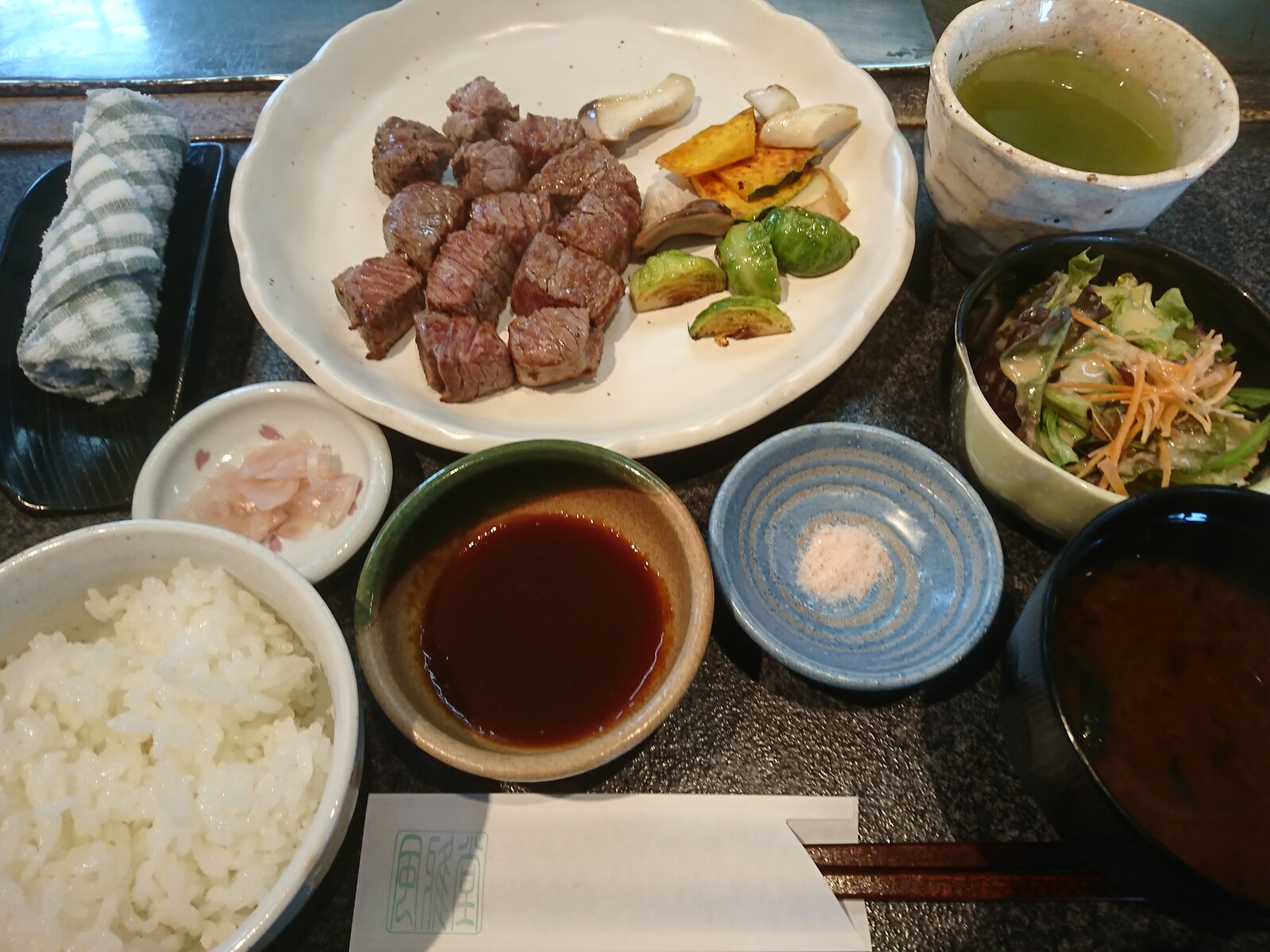 さて、そんな開発駅に、初めて降り立って訪れたのが「ステーキ風雅堂」。まだランチタイムだったから、『ステーキランチ星』を肉200ℊにしていただいたよ。登場したのがこちら。
