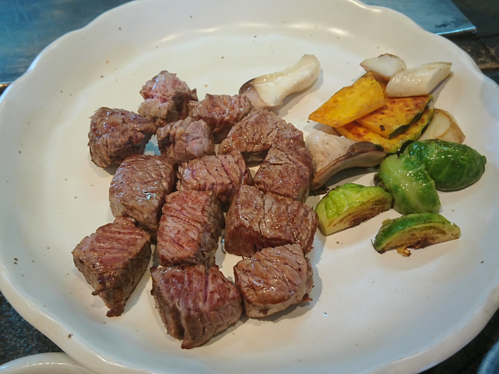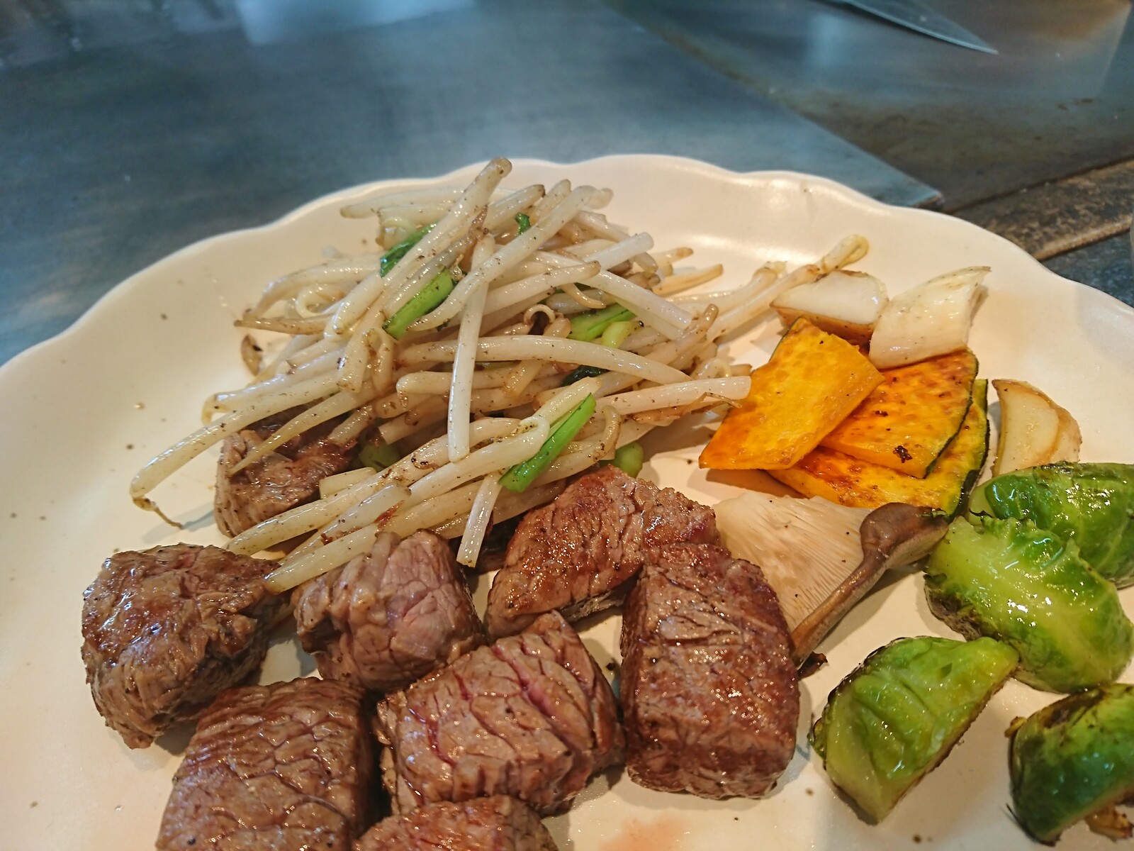 野菜は、カボチャとエリンギと芽キャベツ。あとからシャキッとしたもやしも登場してきて、ステーキの合間に、楽しむことができたよ。