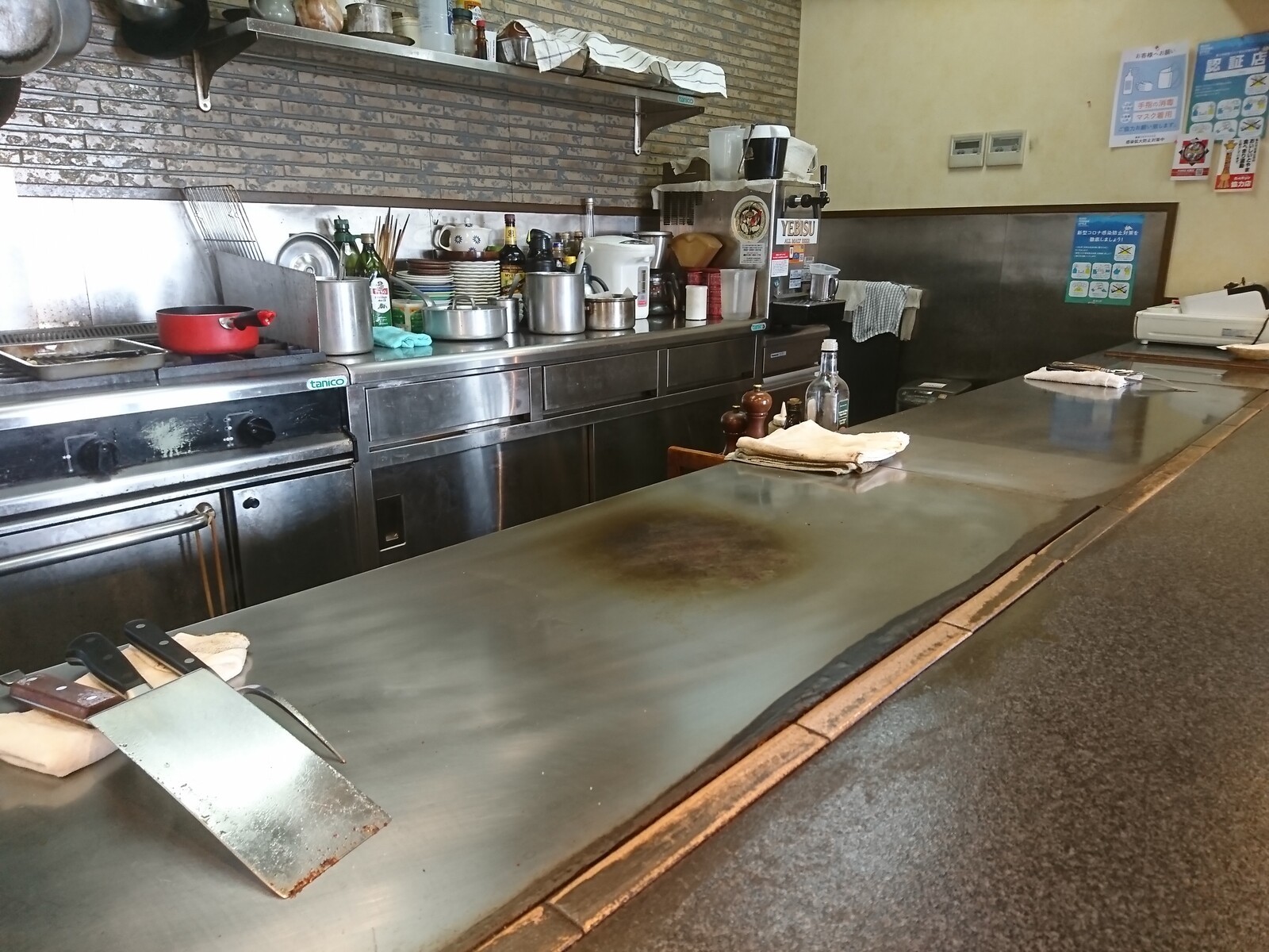 大きな鉄板のカウンター。焼き上げるところが決まってるようで、そこだけ焦げ目が残っているのもなんだか素敵。