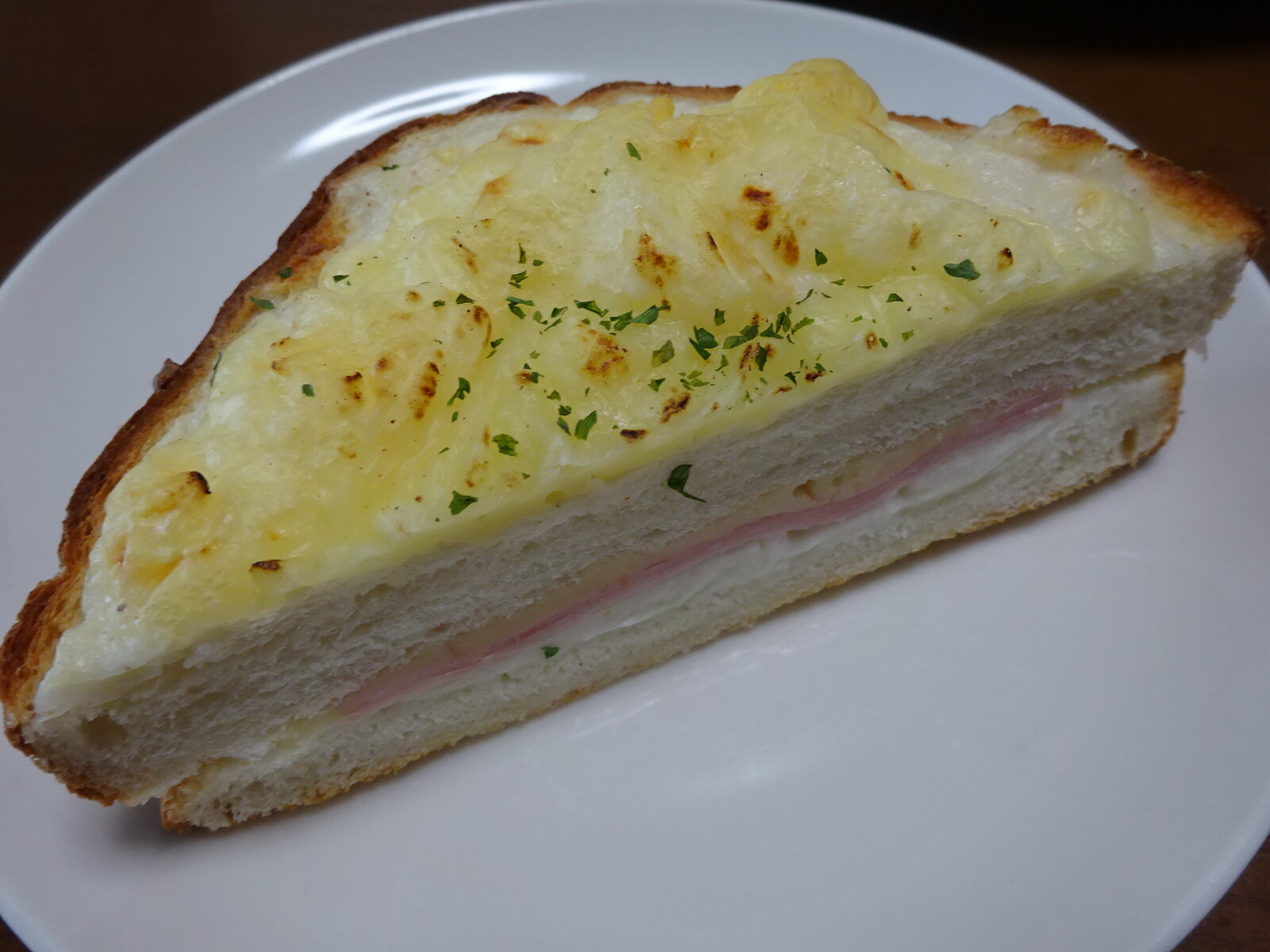 しか〜し、この日のヒットはこちらの『クロックムッシュ』だよ。ハム&チーズとホワイトソースをサンドして、さらにチーズをのせてバターで焼いた、手のかかった一品だよ。何層にも、味わいが重なっているのが素晴らしい、逸品だったんだ。