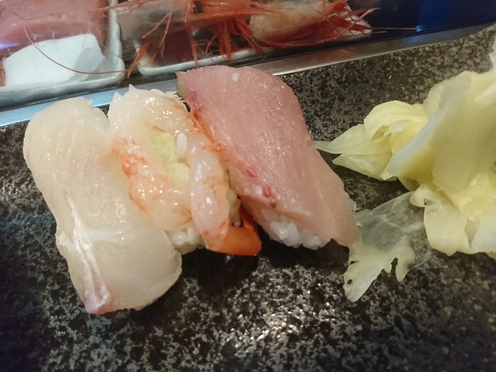続いて登場したのがこちら。ボクには、『甘エビ』しかわからなかったけどね。そして写真はここまで。ウニやイクラの軍艦巻きなんかも出て、なかなか楽しめるラインナップだったよ。