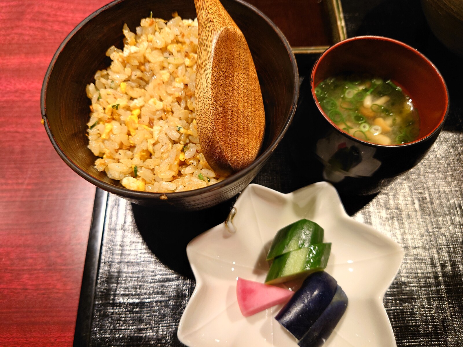 〆のご飯は、『ガーリックライス』にしてもらったよ。みそ汁は、これまで味わったことのないだしでつくられていて、いったい何のだしだろ、っていいながら味わったよ。