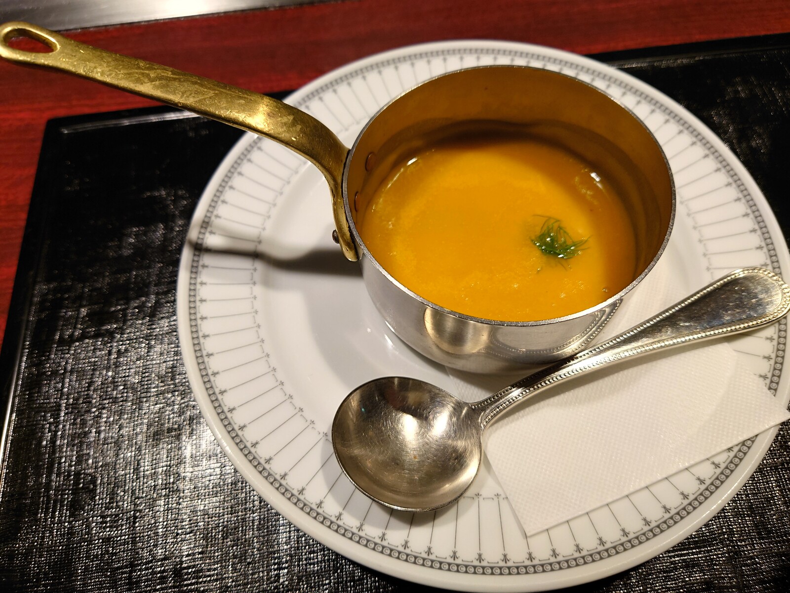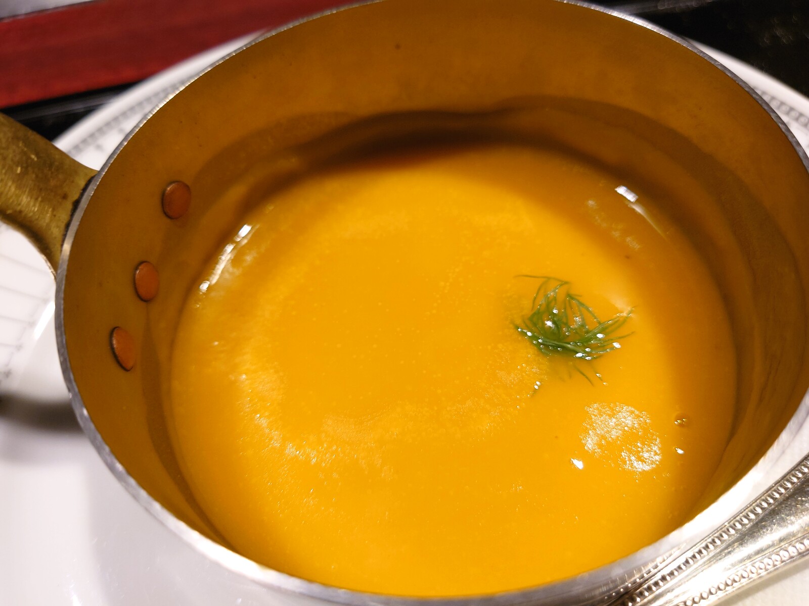 続いて登場したのは鉄板の上で温められたスープ。『カボチャと生しょうがのスープ』だよ。