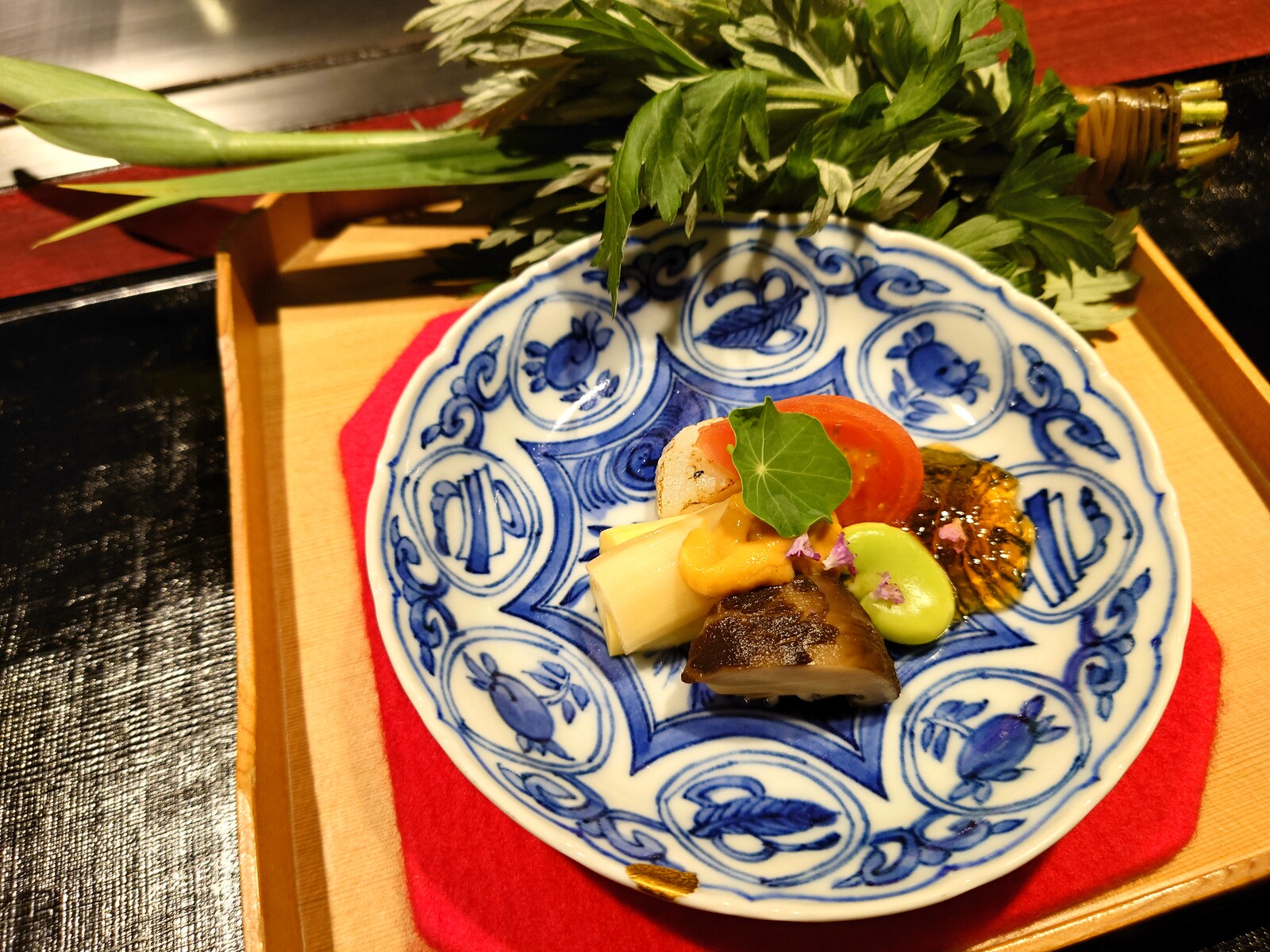お通しには、『すす竹とうにと帆立のジェル添え』。よもぎ束を添えて季節感を演出しているところがにくいよね