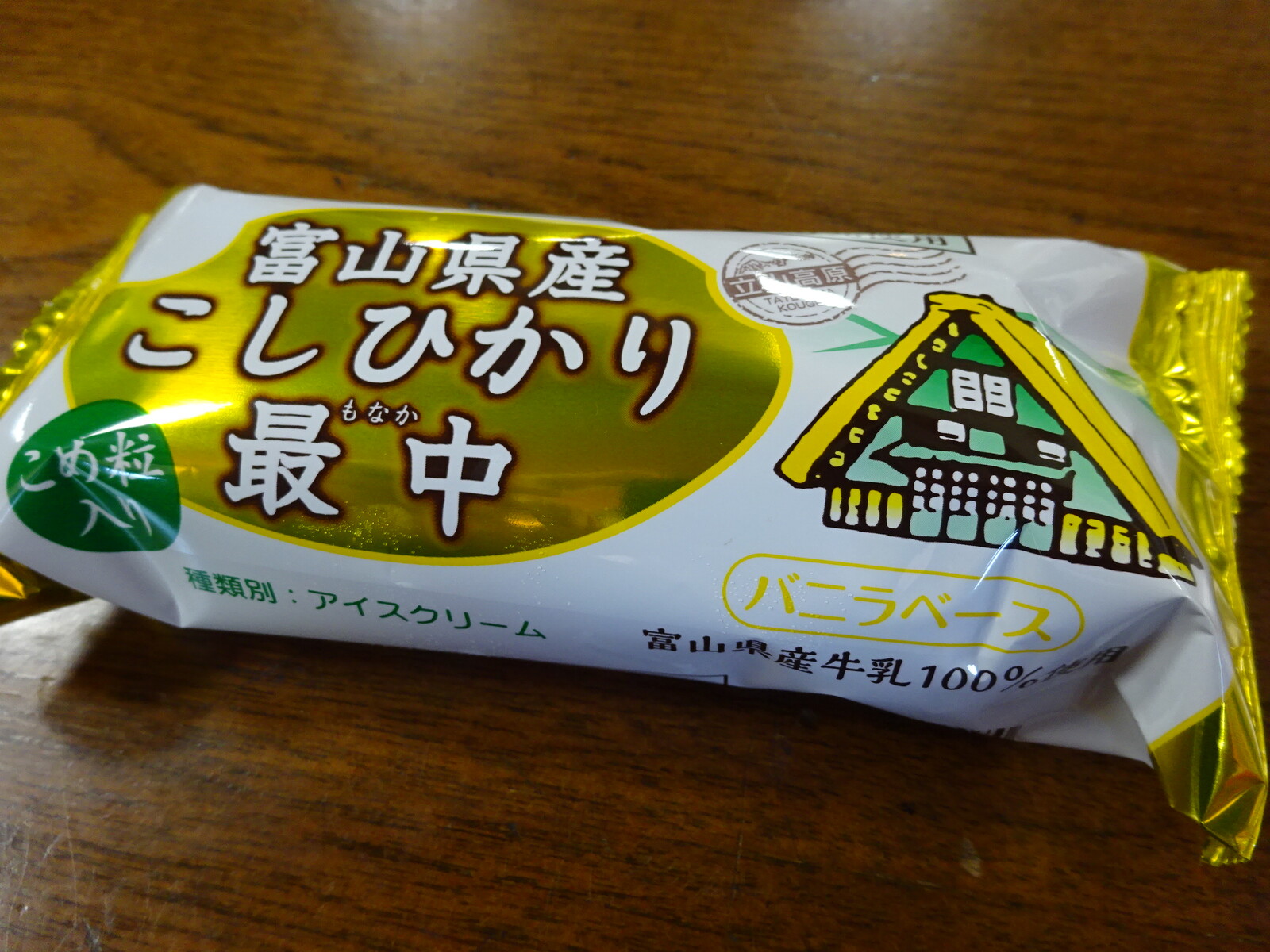 この日は、立山駅内のお土産屋さんで、『富山県産こしひかり最中』を発見。どうやらアイスの中にコシヒカリの米粒を入れたもなかの様子だねぇ。これは食べてみるしかあるまい。けっこう歩き回った後だったから、冷たいアイスでちょっと一息ついたんだ。