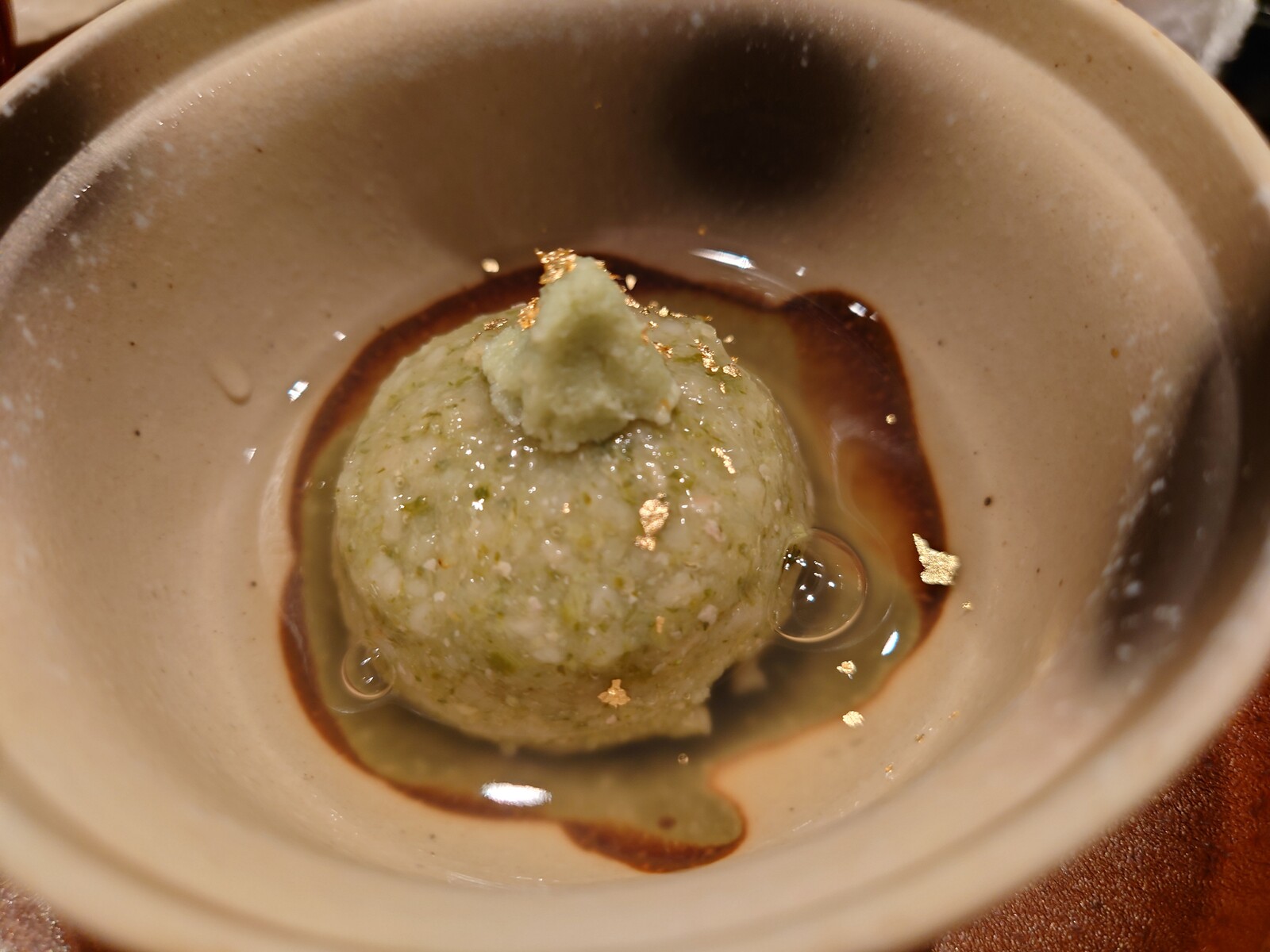これは、しんじょのような、ちょっとざらっとしたような食感はそうでないような・・・。上に金箔を散らした、豪華な一品。