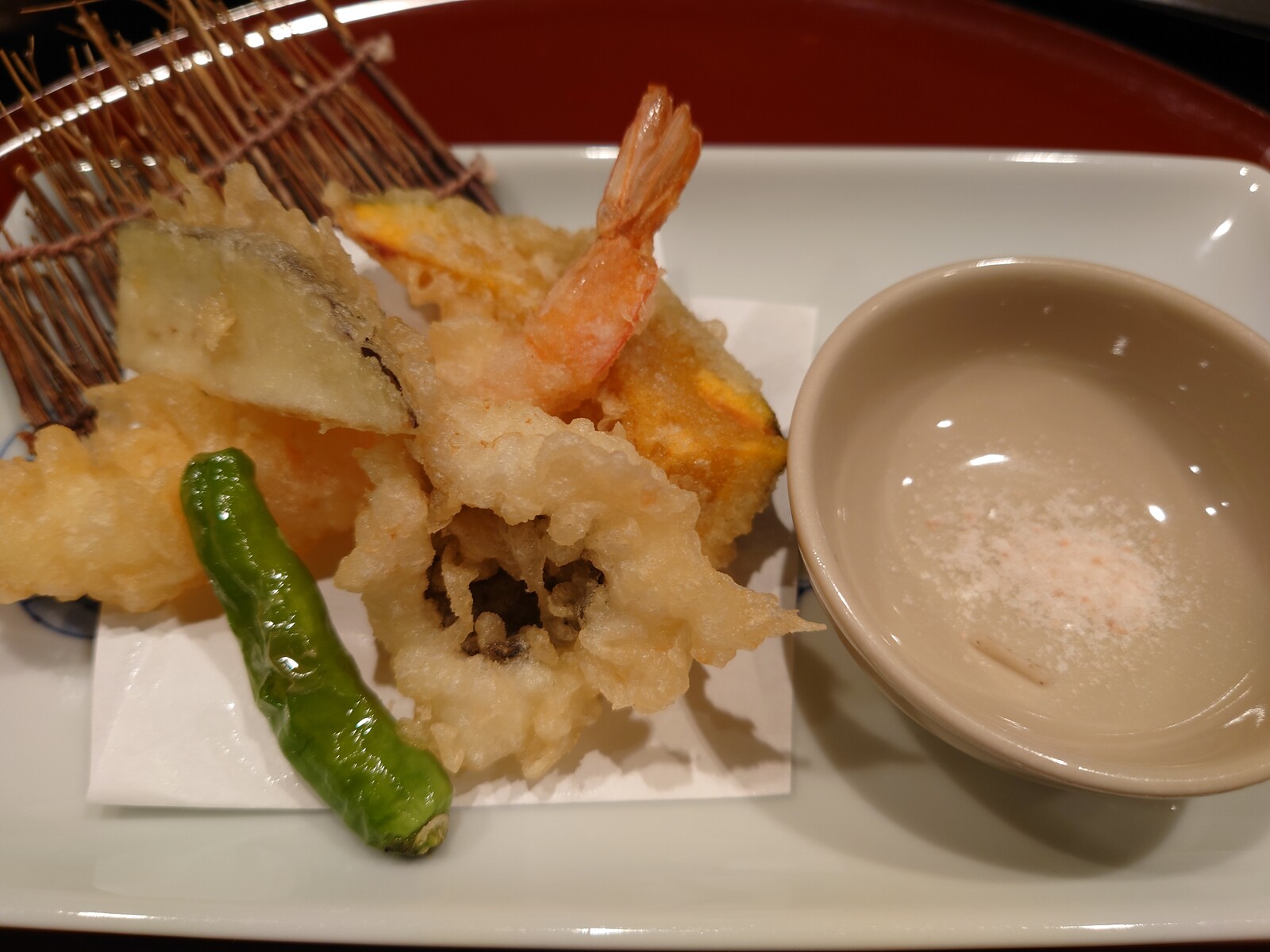 天ぷらは、塩でいただくあたりに、素材の良さへの自信が感じられるのだ。えびの他には、なす、ししとう、かぼちゃといった今の季節のとれたて野菜。生しいたけも天ぷらになっていて、それがボク的には、意外とよかったんだよね。