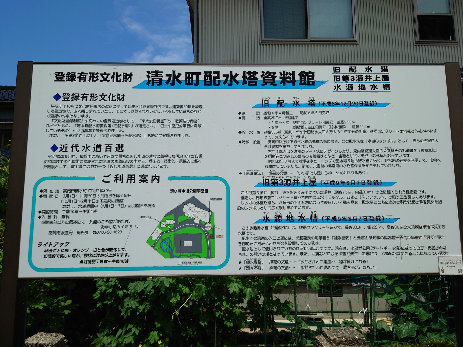 何ともおもむきのある給水塔の正式な名前は「清水町配水塔」。昭和6年に完成した後は、高岡の近代水道システムのシンボルとして親しまれたみたい。眺めていると、時代に吸い込まれそうな気持ちになるんだ。