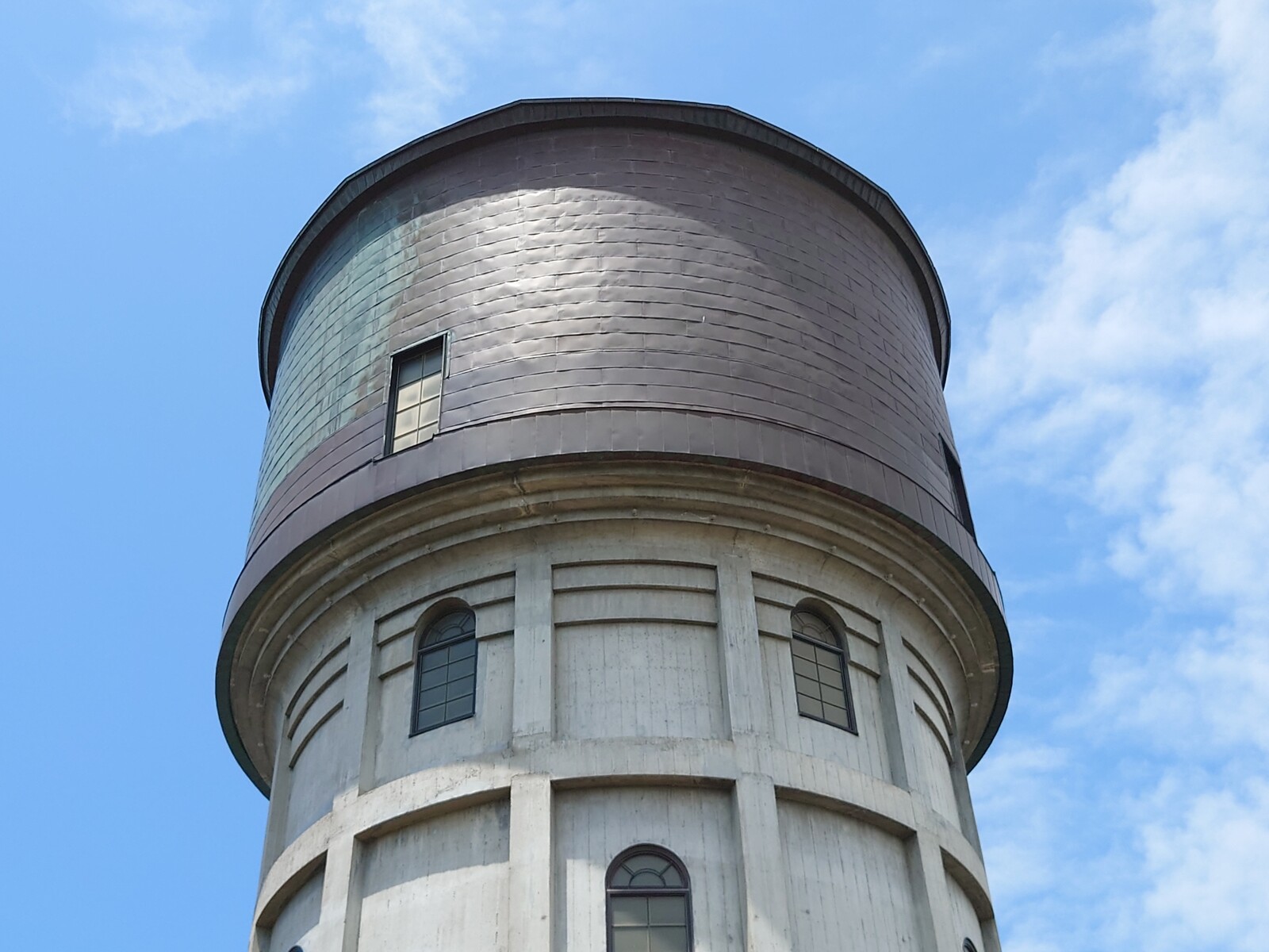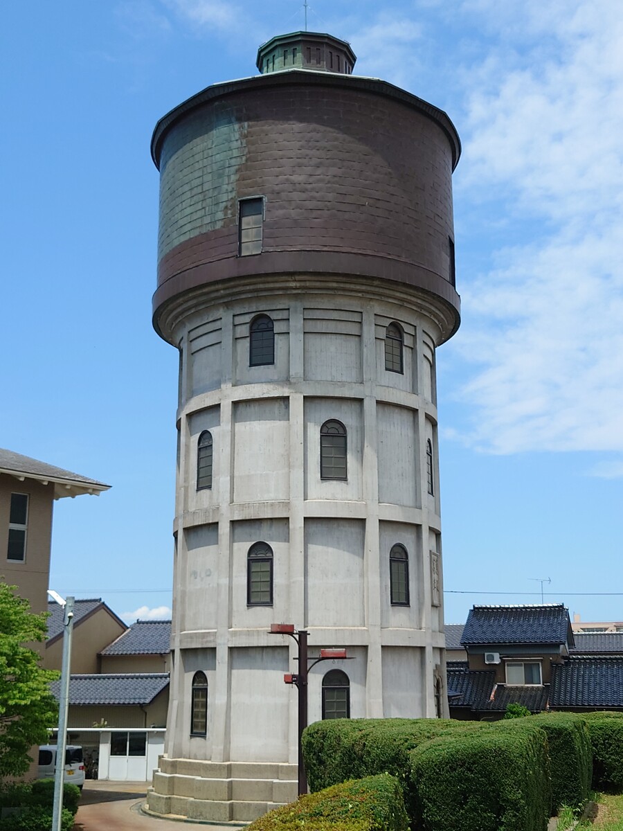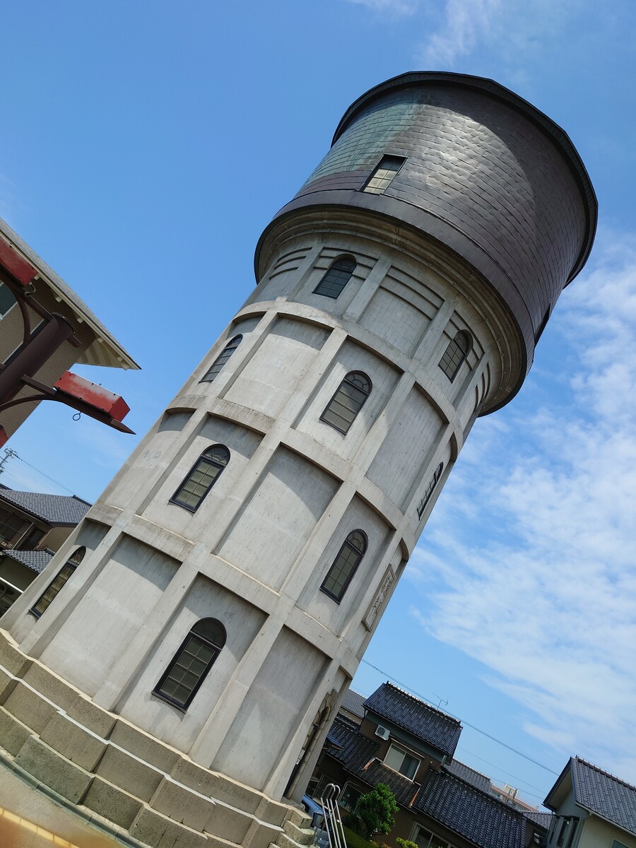 ところが、建物の横をふと見上げると、目に入ったものがあったんだ。この円筒状の給水塔のようなものは、「あいの風とやま鉄道」に乗っていて、高岡から少し小矢部寄りに進んだところで見える、あの給水塔ではないだろうか。