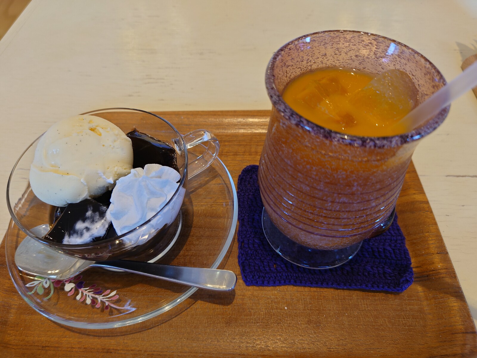 。この日は、『コーヒーゼリー』を、『マンゴージュース』をセットにして頼んでみたよ。登場したのがこちら。