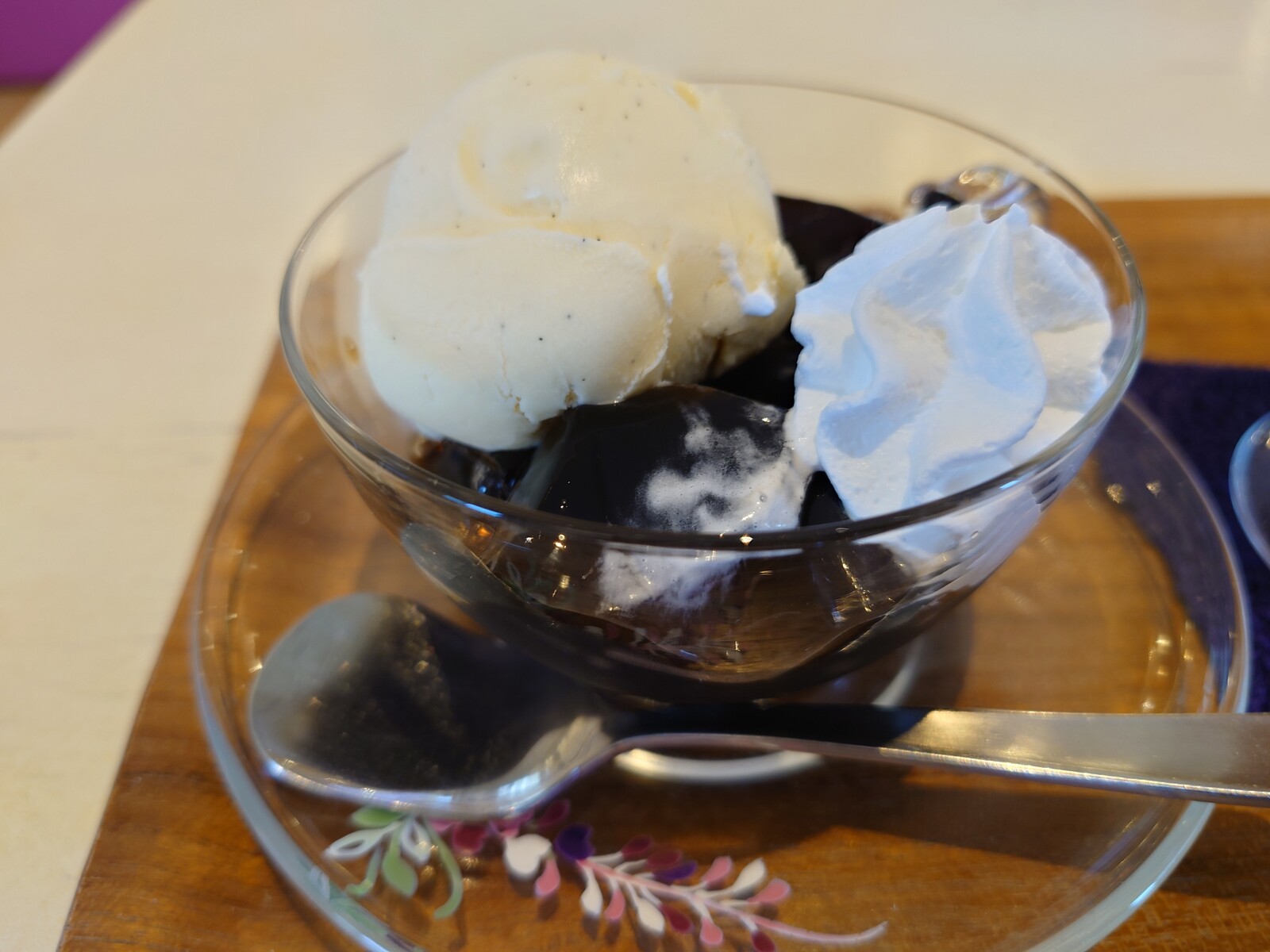 自家製のコーヒーゼリーには、バニラアイスと生クリームがのせてあったよ。クリームの甘みが、コーヒーゼリーの苦味を引き立てていて、楽しく味わえる一品だったな。