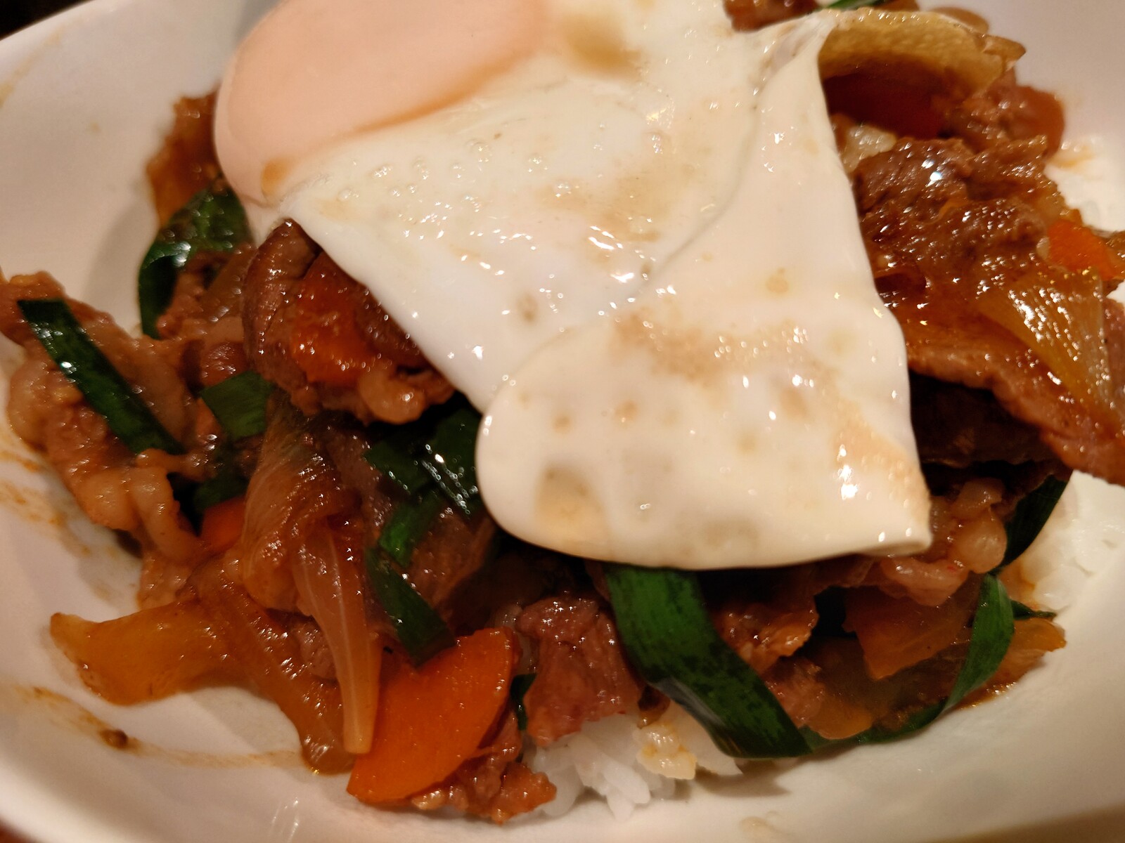 。『プルコギ丼』に目玉焼きをトッピングしてみたんだ。しょうゆベースの甘いたれで味付けした肉が、ご飯にはぴったりだよね。それに、目玉焼きをからめて食べるだなんて、もうこれ絶対旨いやつ。