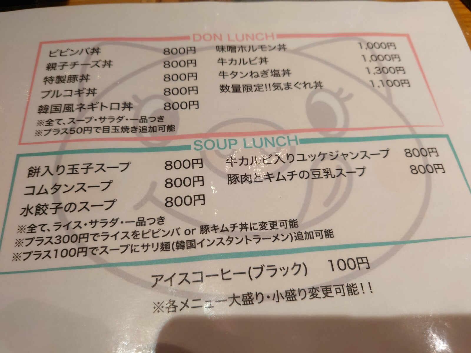いかにも韓国なラインナップのランチメニュー。スープランチは、+300円でライスがビビンバになるのがうれしいメニュー。ユッケジャンとカルビの取り合わせにしたらよかったと、後悔することしきりだったよ。