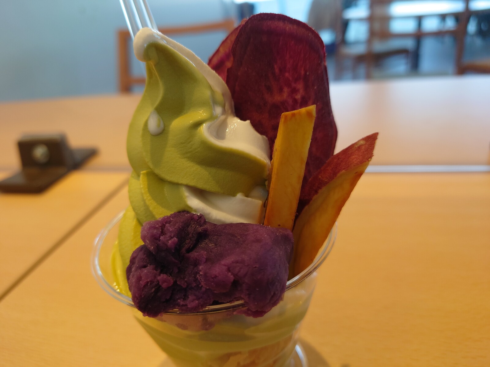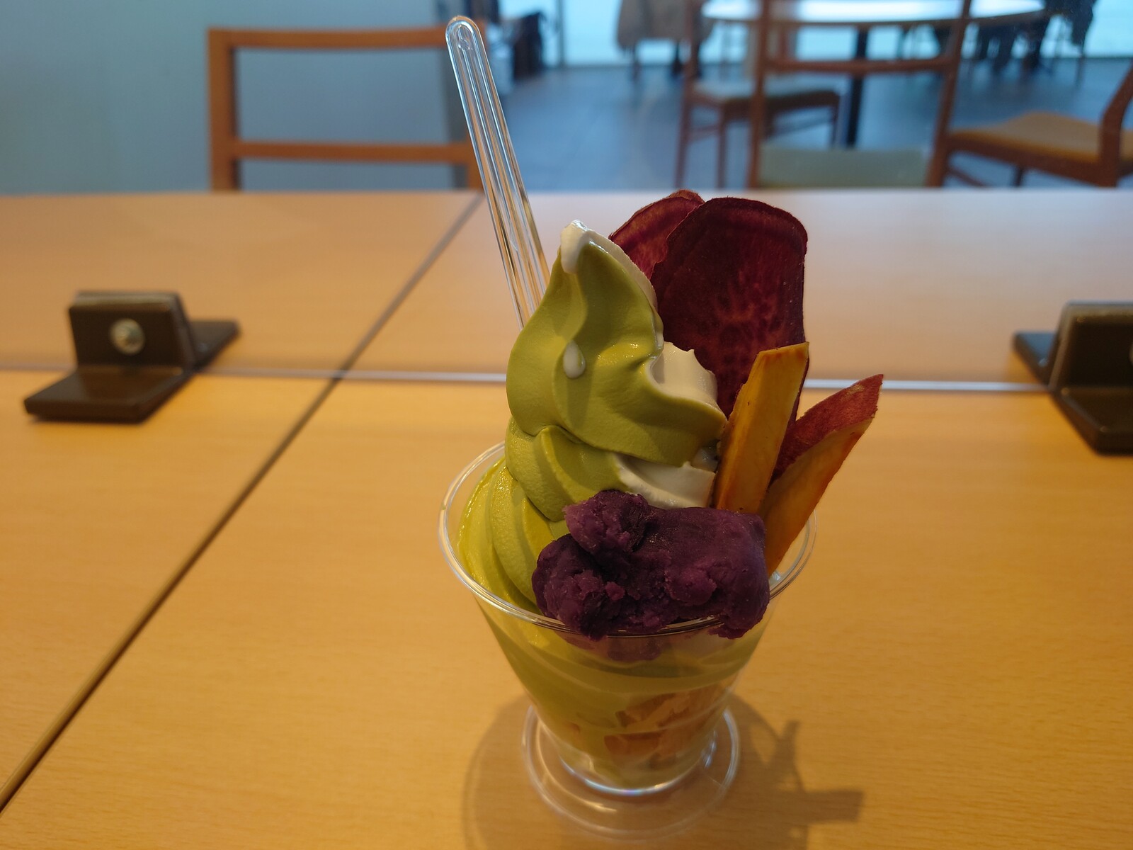 2階のカフェコーナーで、『お芋サンデー』と一緒に、ぼんやり外を眺めていたよ。窓際の2人席はカップルの皆さんに譲って、ボクは、壁際の広い席でくつろいでみるのだった。