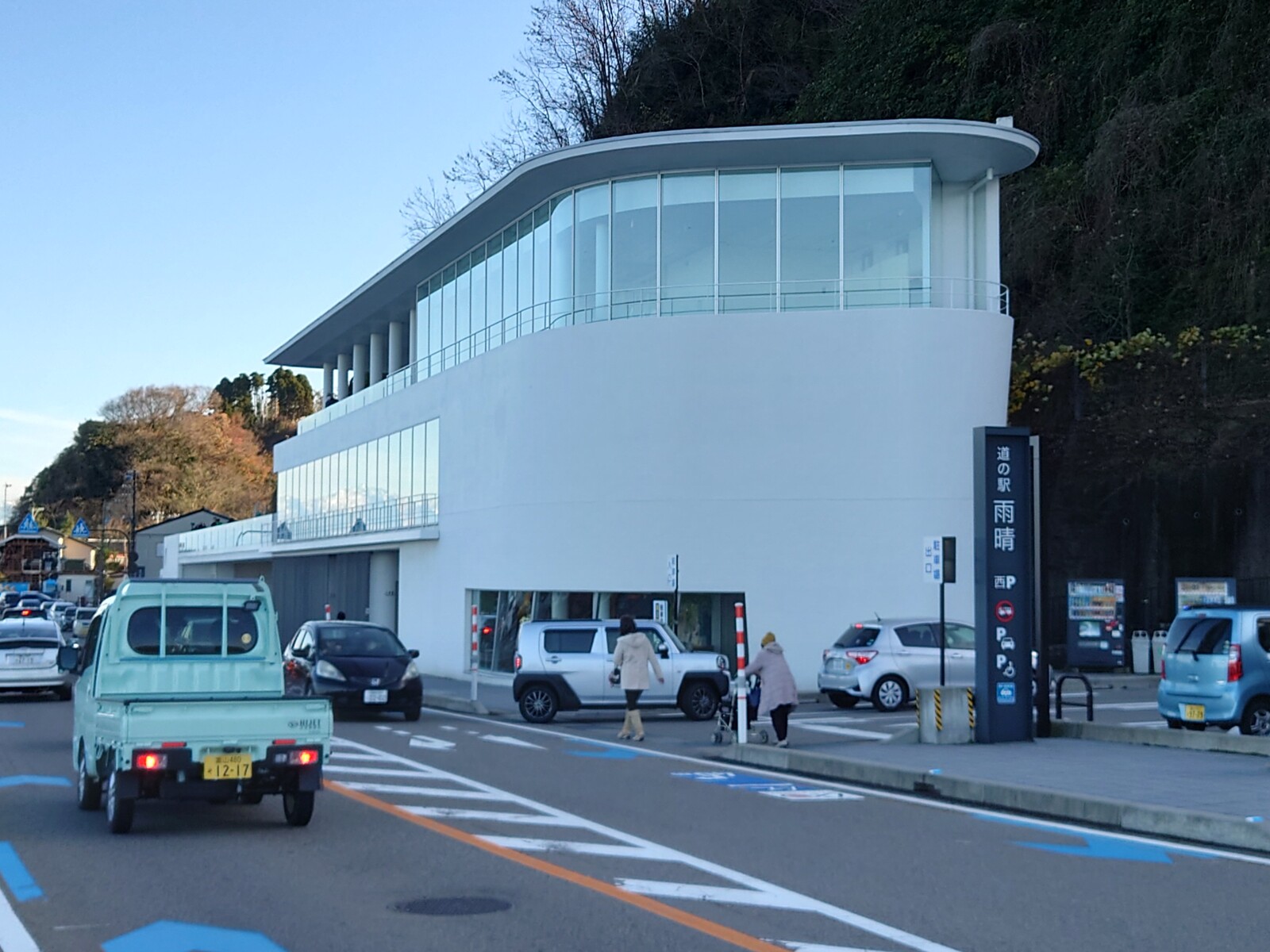 雨晴海岸で、立山の眺めを十分堪能したボクは、一休みするために「道の駅 雨晴」に寄り道してみたよ。白亜にそびえ立つ道の駅は、最近の道の駅としてはやや小ぶりだけど、観光客が多く訪れる「雨晴海岸」を近くに控え、絶好の休憩スポットとして、とっても人気だね。