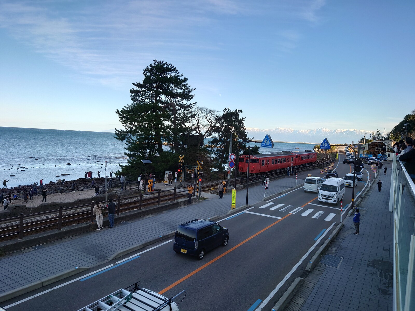 展望デッキから、義経岩の横を氷見線が走り去る姿が見えるのも素敵。