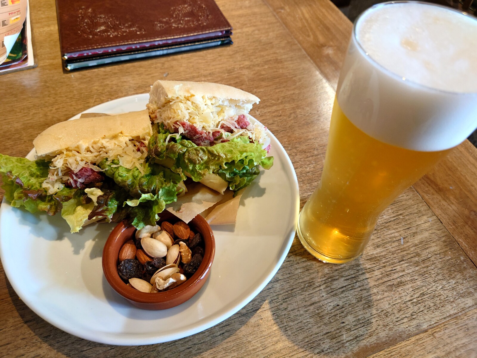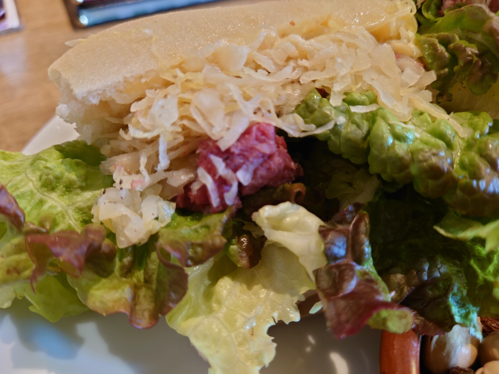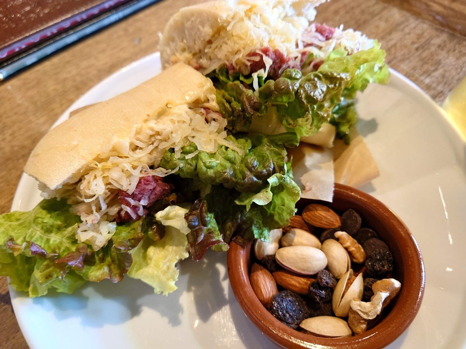 たっぷりのザワークラウトは、キャベツが柔らかく漬かっていて、優しい酸味が、コンビーフの味を引き立てるのだ。盛り盛りのサラダ菜もヘルシーな逸品だったよ。ナッツが添えてあるんだけど、それをつまみながら食べると、味のアクセントになって面白かったな。
