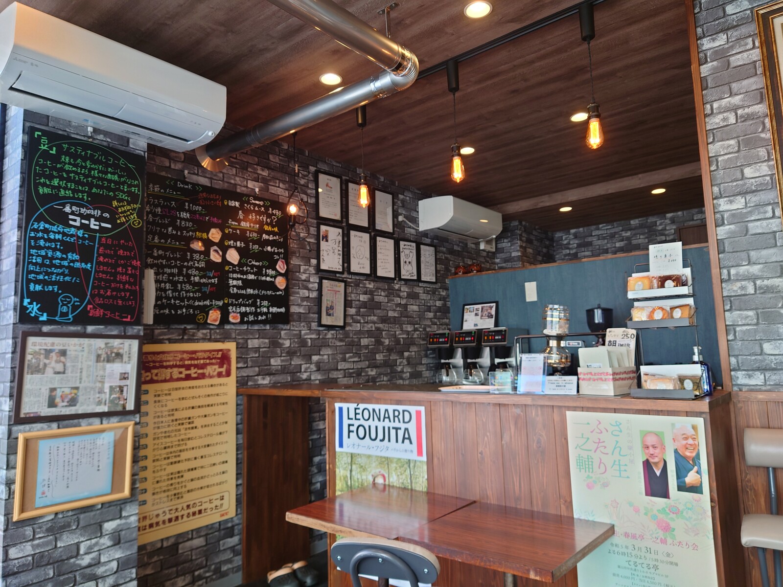 カウンターの向かいに、焙煎機をはさんでちょっとだけイートインスペースのある、小さなお店なんだ。でも、こころざしはとても高くて大きいよね。