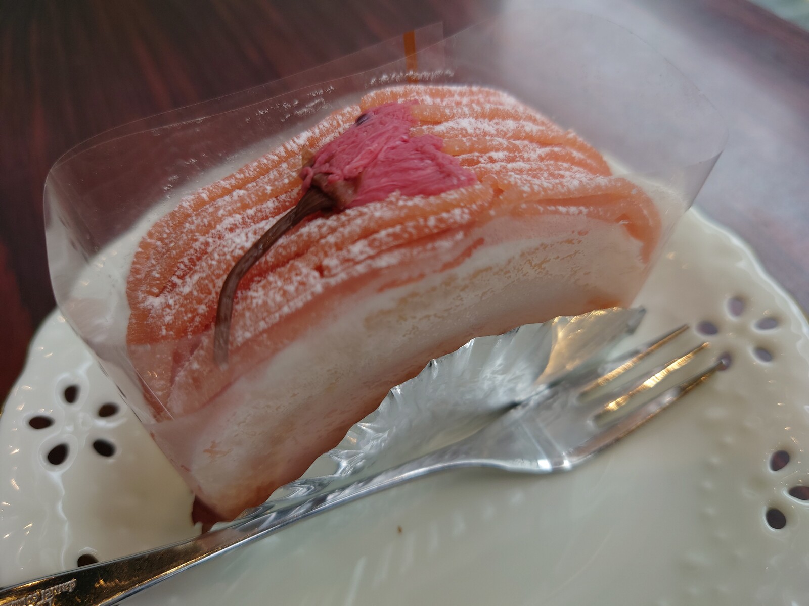 これがねぇ、薄いスポンジケーキに包まれた内側は、最初、桜餅の香りの生クリームと思っていたんだ。けど、少し食べるうちに、その溶け切らない食感に、おお、これは超ふわふわのムースではないかと気づいたんだよね。こんなにふわふわしたムースは初めて食べたんだ。いやぁ、全くもって素晴らしい。