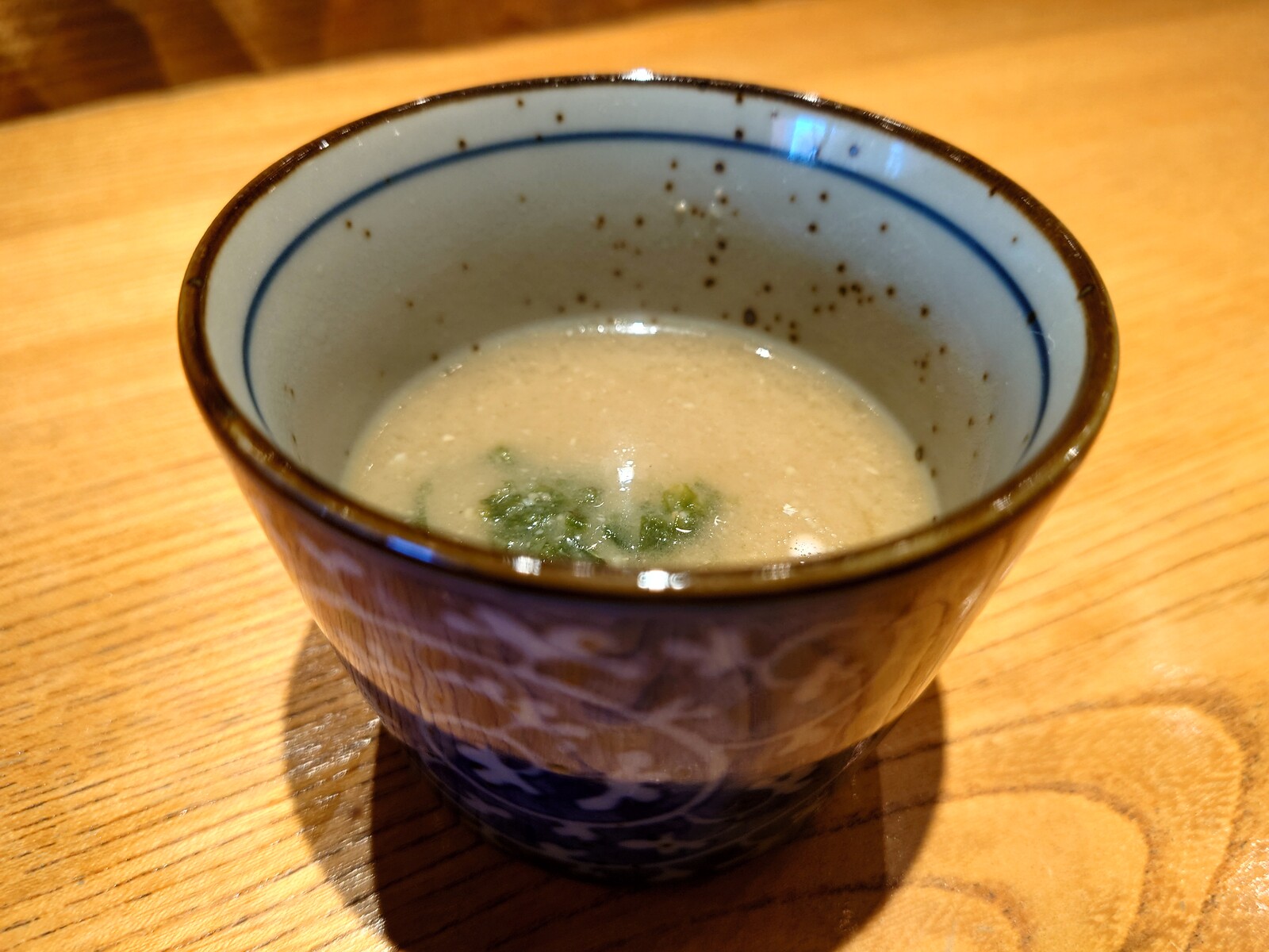 お勘定を頼んだら、締めにみそ汁を1杯、出してくれたんだ。あおさの入ったみそ汁は、魚でとった出汁が、濃厚で旨味たっぷり。それでいて、魚独特の臭みとかえぐみとかは一切感じない、見事な1杯だったよ。