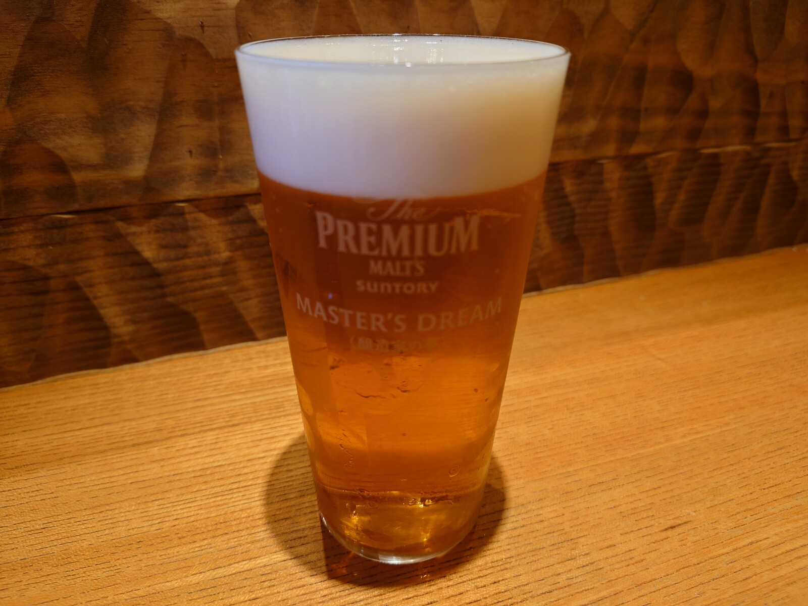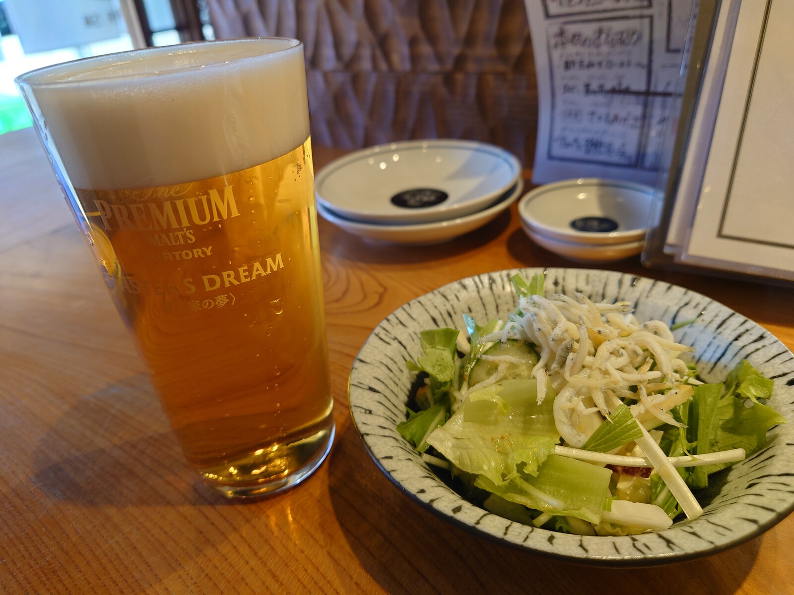 まずは、生ビールを1杯。お通しがサラダとは、何ともヘルシーではないか。しらすがのってて、しっかり酒の肴になるよね。