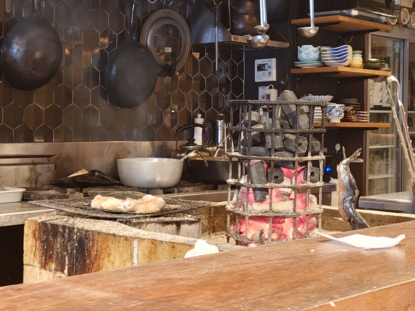 この日は、カウンターに座っていたから、料理が出来上がっていく様子がよく見えたんだけどね。その様子を見てるだけでも、また、酒がすすむといった具合。左の網で表面を焦がすように焼いた後は・・・、
