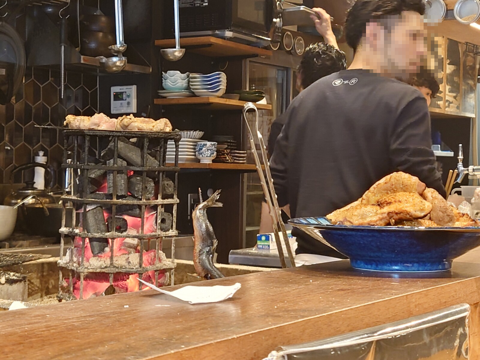 。カウンターの上に大皿盛になってた『鶏肉炭火焼き』が、いかにもうまいのでございます、と名乗りを上げていたから、ついつい頼んでしまったな。登場したのがこちら。囲炉裏で焼き上げた後、さらにオーブンでローストされて、とても香ばしく仕上がっていたんだ。