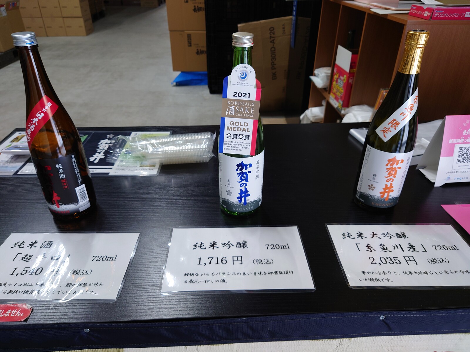 3本とも飲みくらべたあげく、右端の純米大吟醸「糸魚川産」を購入したよ。糸魚川でとれた酒米だけを使って造ったという純米大吟醸は、純米吟醸よりもさらに香りが立っていて、その甘い香りが特徴的。旨味もふくよかで、とっても素敵なお酒だったんだ。糸魚川限定販売というのがもったいない。